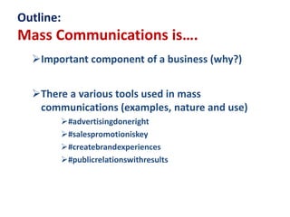 Mass communications is essential for businesses to effectively launch products, compete in the market, and build brand experiences. Key strategies include defining target markets, setting objectives, establishing budgets, developing messages, choosing media, and measuring effects. Effective mass communications encompass advertising, sales promotions, and public relations to enhance customer engagement and brand reputation.