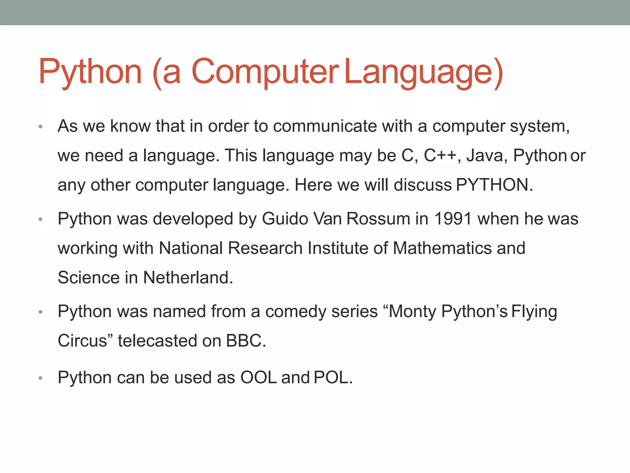 This document provides an overview of the Python programming language. It discusses that Python was created by Guido van Rossum in 1991 and named after Monty Python. Python can be used for both object-oriented and procedural programming. It is easy to learn and use, platform independent, has a simple syntax like English, and is free and open source. The document then describes how to install Python from the python.org website and introduces interactive and script modes for working in Python. It also provides some examples of applications that can be developed with Python.