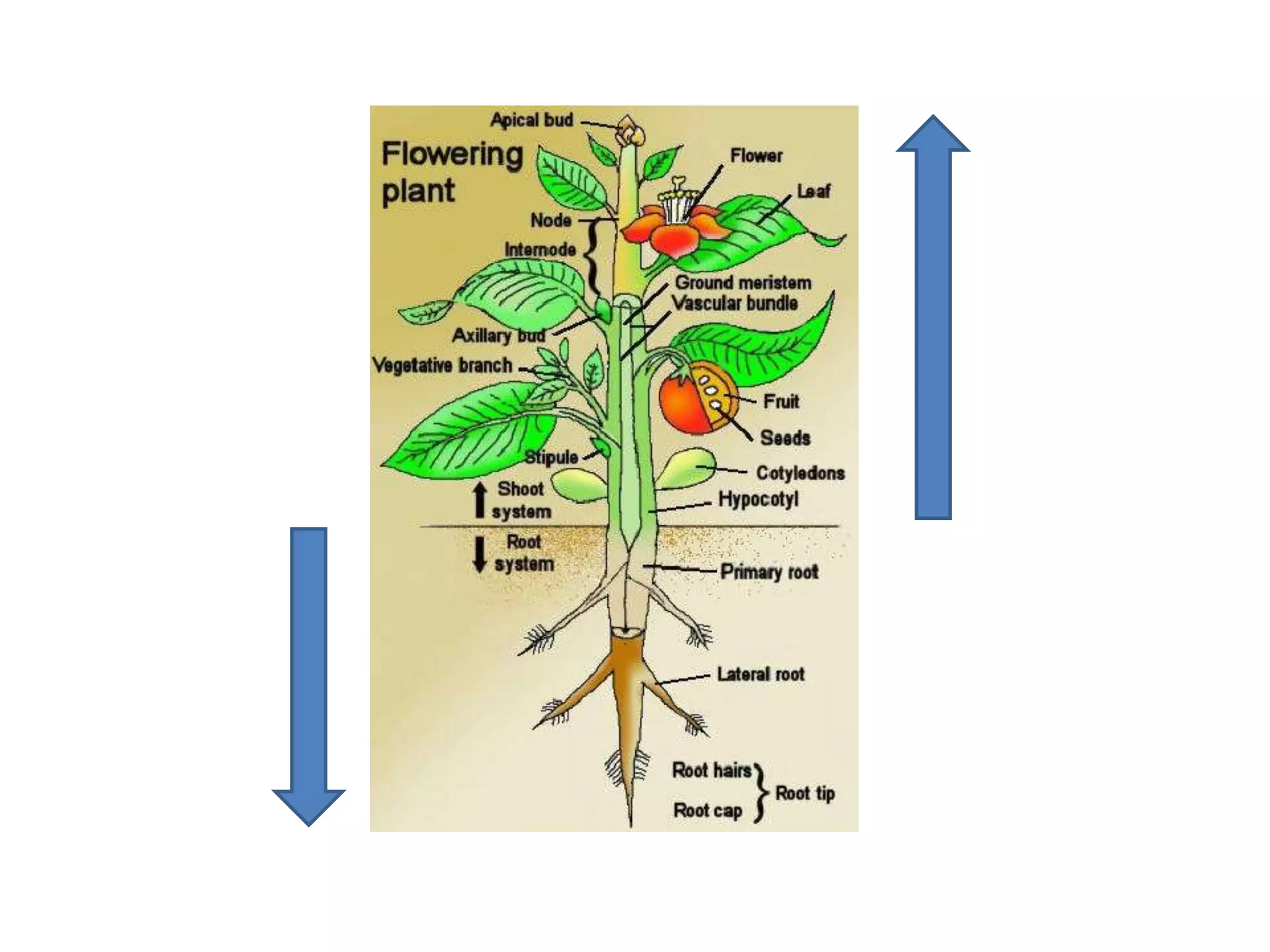 The document discusses the four main plant parts: flowers, leaves, stems, and roots. It describes their key functions, such as flowers being the reproductive part that contains seeds, leaves producing food through photosynthesis, stems supporting leaves/flowers and transporting water/nutrients, and roots anchoring plants and absorbing water/nutrients. It also defines different types of each part, such as the four types of plants based on their stems (trees, shrubs, herbs, vines), and two main root systems (taproot and fibrous roots).