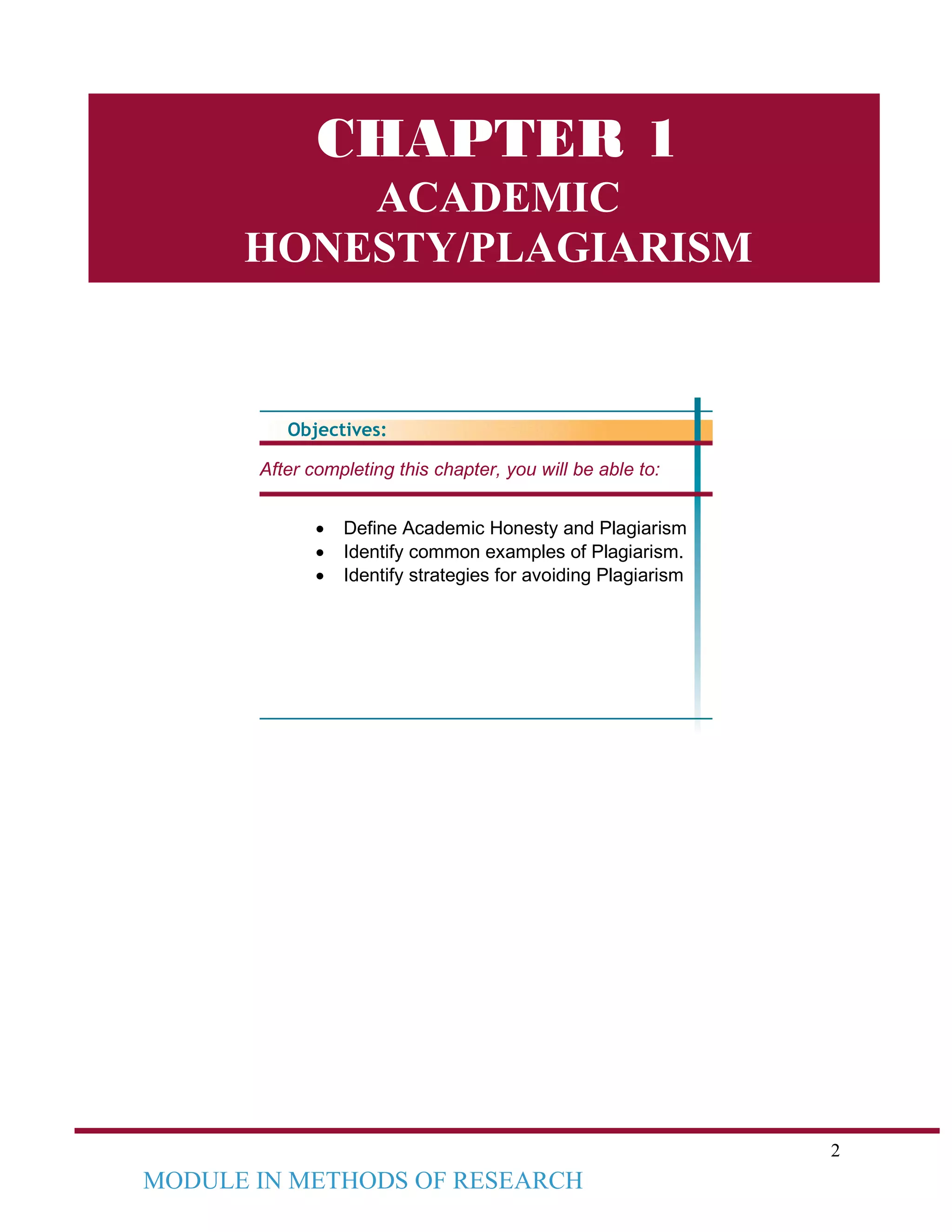 This document provides information about academic honesty and plagiarism. It defines academic honesty as producing original work and citing sources appropriately. Plagiarism occurs when a student presents someone else's work as their own without citing the source. There are different types of plagiarism, including direct plagiarism by copying word-for-word without citation, self-plagiarism by reusing one's own previous work, and mosaic plagiarism by paraphrasing close to the source without citation. Maintaining academic honesty is important for the integrity of educational institutions and society.