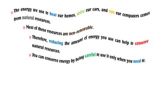 This document provides an overview of different types of energy sources, both renewable and non-renewable. It begins with definitions of renewable and non-renewable resources, giving examples of each. The main types of energy sources discussed include fossil fuels like petroleum, coal and natural gas; alternative sources like nuclear fission, solar, wind and hydroelectric; as well as geothermal, biomass and fusion energy. For each type, the document describes how the energy is produced, benefits and drawbacks. Figures and diagrams are included to illustrate concepts like the nuclear fission process and geothermal power plant design. Students are prompted throughout with questions to check understanding.