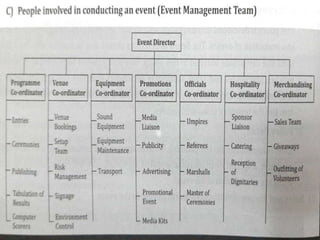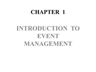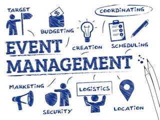 This document provides an overview of event management. It defines event management as the process of planning, organizing, coordinating, analyzing, marketing, producing, and evaluating events. It discusses the meaning and need for event management. Some key aspects covered include the characteristics, types, and scope of events; decision making in event management; the roles of event managers and other staff; establishing policies and procedures; and record keeping systems.