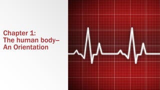 The document provides an overview of human anatomy and physiology. It discusses the main body systems including integumentary, skeletal, muscular, nervous, cardiovascular, lymphatic, respiratory, digestive, urinary, and reproductive. It covers anatomical terminology including positional, regional, and directional terms. It also describes the levels of structural organization from cells to organ systems. Additionally, it discusses homeostasis and how the body maintains stable internal conditions through feedback mechanisms.