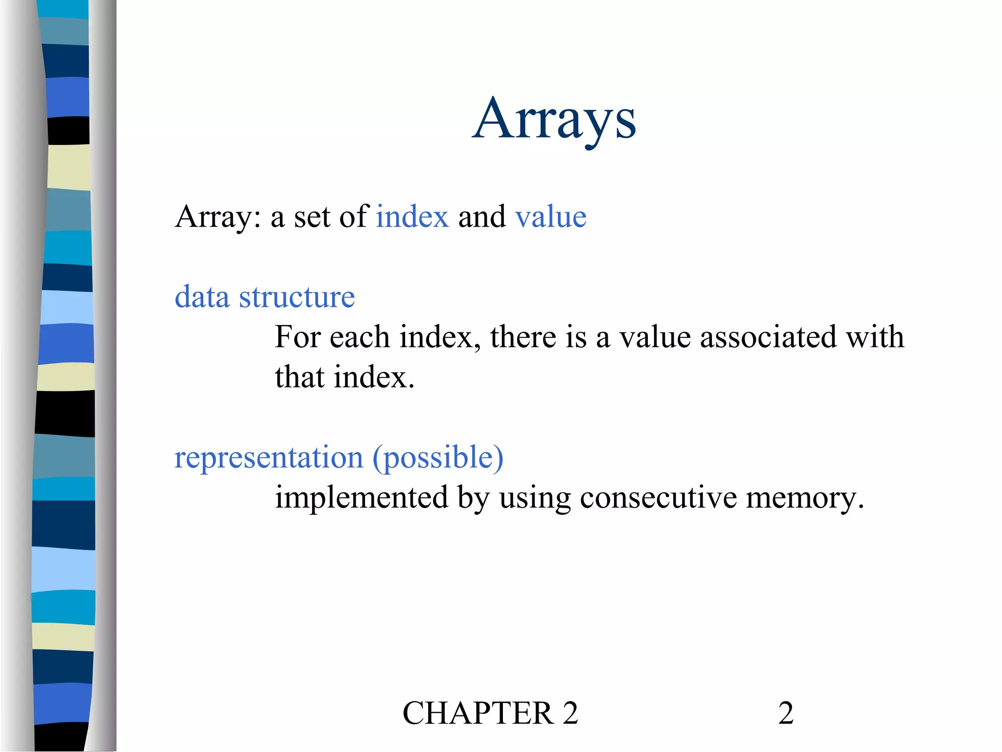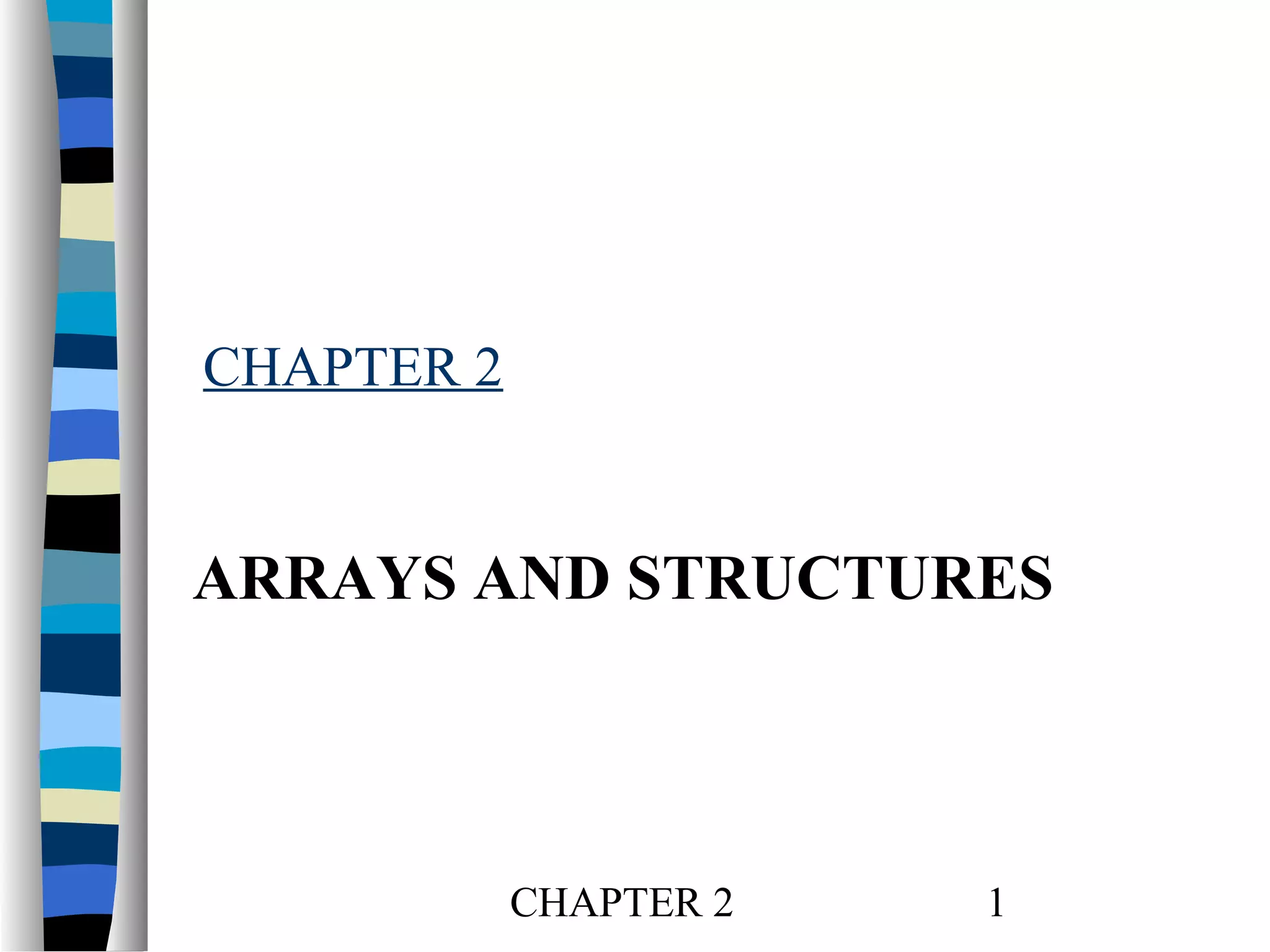 Arrays are data structures that store a collection of data elements of the same type using a single variable name to represent the entire collection. Structures group together data of different types under one name. Sparse matrices represent matrices with many zero elements by only storing the non-zero elements, using triples of row, column, and value to represent each non-zero term. Transposing a sparse matrix involves taking each non-zero term <i,j,value> and storing it as <j,i,value> in the transpose.