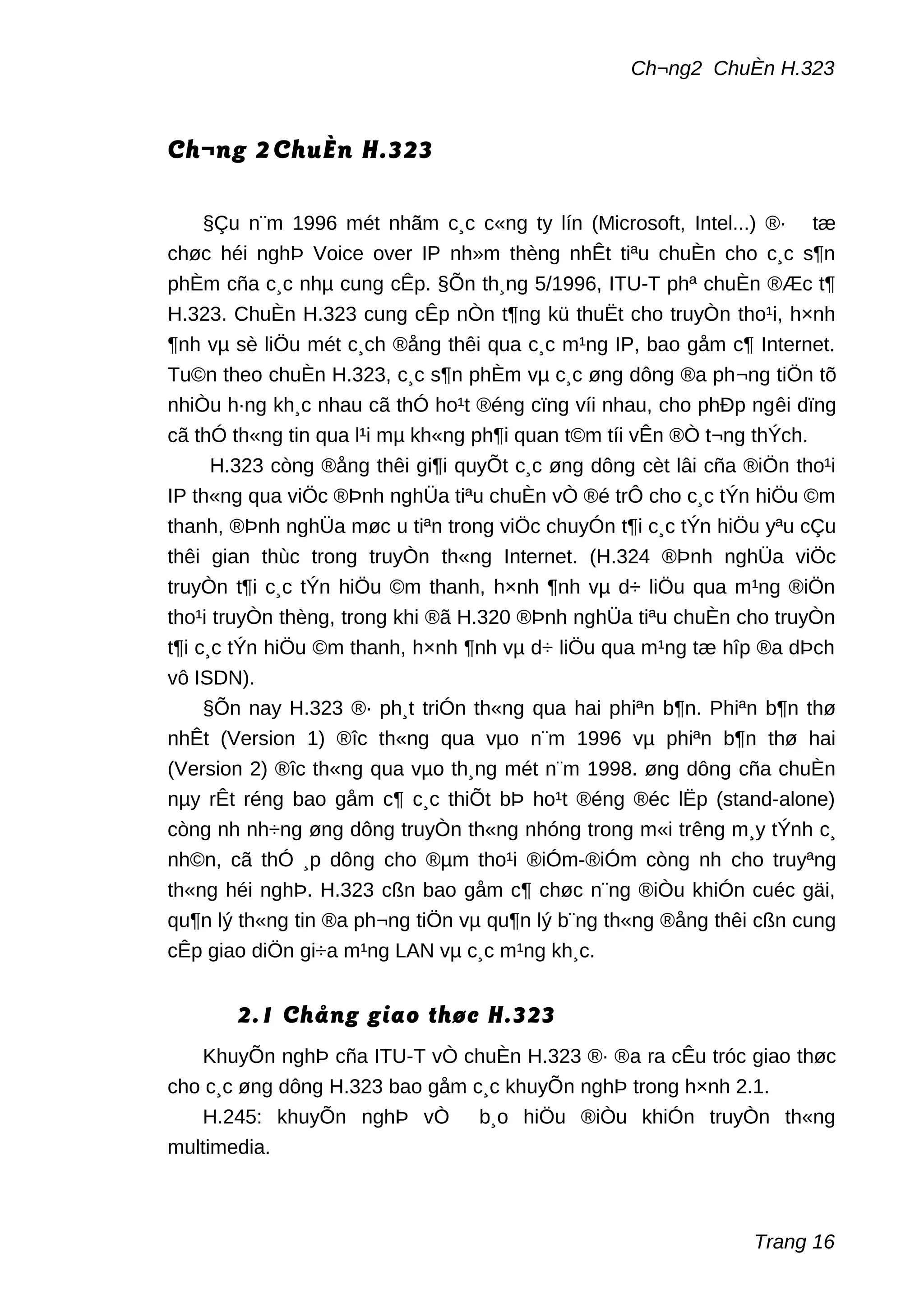 Tài liệu mô tả chuẩn H.323, được phát triển vào năm 1996, là một tiêu chuẩn cho Voice over IP, cho phép truyền thông thoại, hình ảnh và dữ liệu qua mạng IP, bao gồm Internet. H.323 cho phép các ứng dụng và thiết bị khác nhau tương tác với nhau, đồng thời cung cấp dịch vụ điều khiển cuộc gọi, quản lý thông tin và giao thức để đảm bảo truyền dẫn đa phương tiện hiệu quả. Chuẩn này đã phát triển qua hai phiên bản, với các thành phần chính bao gồm thiết bị đầu cuối H.323, gateway và gatekeeper, đảm bảo việc quản lý hiệu suất và kết nối trong hệ thống.