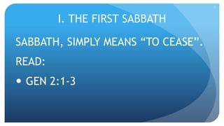 The document discusses the first Sabbath according to Genesis chapter 2. It notes that Sabbath means "to cease" and references Genesis 2:1-3, which describes God resting on the seventh day. It also mentions that the Jews were commanded by God to observe the Sabbath, citing Psalms 147:19-20 and Nehemiah 13:15-22. Additionally, it refers to the Lord's Day as a special day, pointing to Acts 20:7, Matthew 28:1, and 2 Corinthians 5:17. Finally, the document addresses both the Sabbath and the Lord's Day, referencing Colossians 2:13-17 and Galatians 4:9-11.