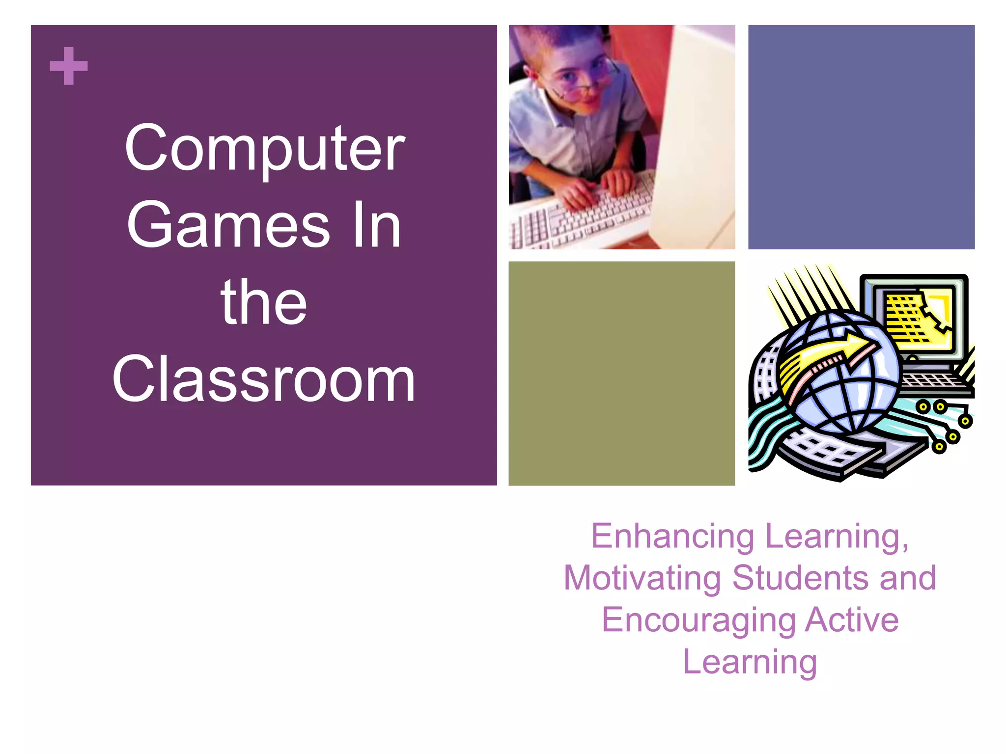 This document discusses using computer games in the classroom to enhance learning, motivate students, and encourage active learning. It first provides background on declining literacy and graduation rates. It then reviews literature on key themes like number sense, brain-based instructional strategies, and the benefits of technology and video games for teaching. The document suggests computer games can help build math fluency through feedback, practice at individual paces, and connecting learning to goals and rules. It indicates more research is needed to address concerns and student needs.