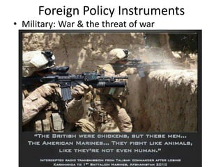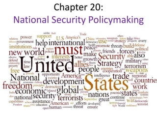 The document summarizes key aspects of US national security policymaking, including foreign policy instruments like the military, economics, and diplomacy. It outlines actors involved in foreign relations such as international organizations, regional groups, companies, NGOs, and individuals. It describes policymakers like the President, diplomats, national security establishment, and Congress. It provides an overview of periods in US foreign policy history from isolationism to the present War on Terror. It also briefly mentions military policy areas.