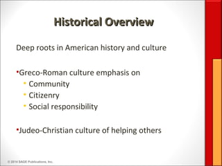 The document provides an overview of the nonprofit sector, including its historical roots in Greco-Roman and Judeo-Christian traditions of community and social responsibility. It discusses the growth of philanthropy following the Industrial Revolution. Key terms like charity, philanthropy, and the various IRS classifications of nonprofits are explained. Statistics are given on the size and economic impact of the nonprofit sector in the US. Different frameworks for categorizing nonprofits are outlined, including their purposes, beneficiaries, and degree of commercialization. Issues around social enterprises and the controversy over nonprofits engaging in commercial activities are also summarized.