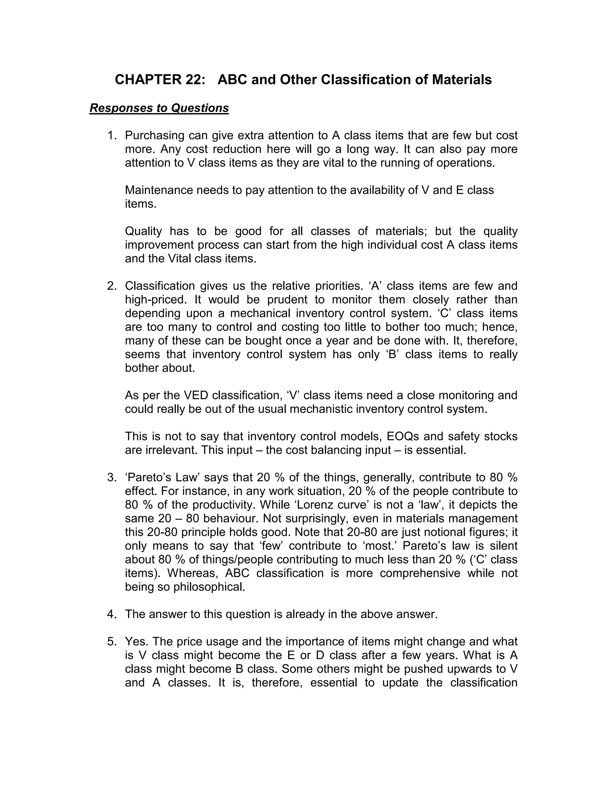 - Class A items are few in number but high in cost, so purchasing should pay them extra attention to reduce costs. Class V items are vital to operations so purchasing and maintenance should focus on their availability.