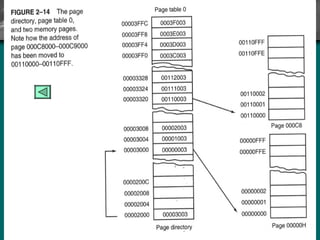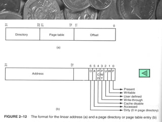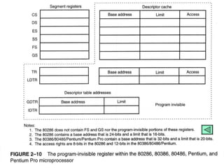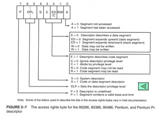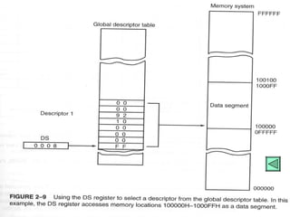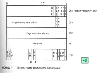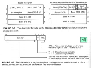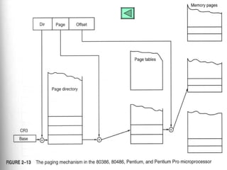 The document discusses protected mode memory addressing and paging in microprocessors. Protected mode uses segment descriptors located in descriptor tables to define available memory segments. It allows accessing memory above 1MB. The segment register contains a selector that chooses a descriptor, specifying the segment's location, length, and access rights. Memory paging allows any physical memory to be assigned to any linear address, invisible translating it to allow relocating and non-contiguous memory. It is controlled by values in control registers that break addresses into parts to access page directory and table entries.
