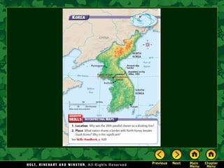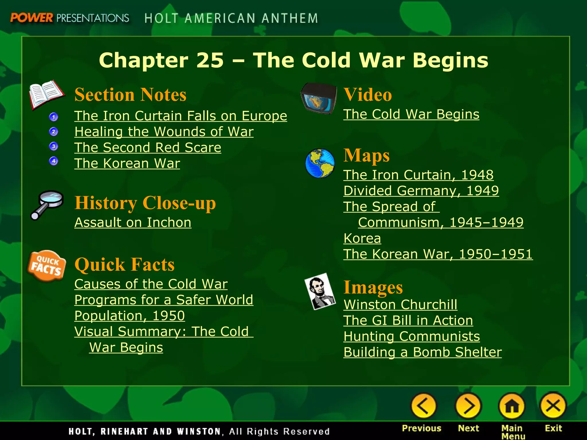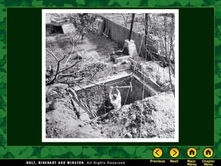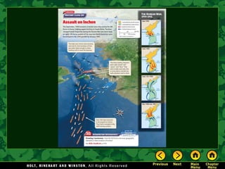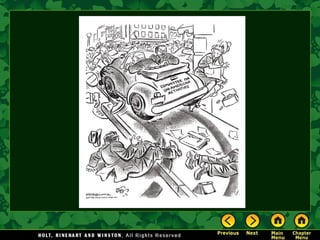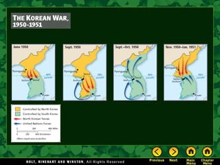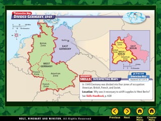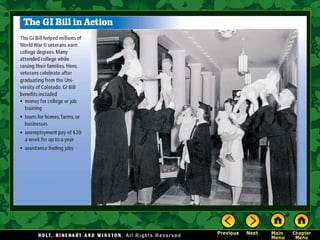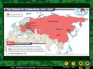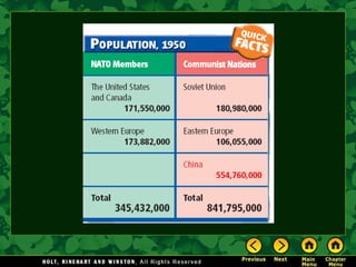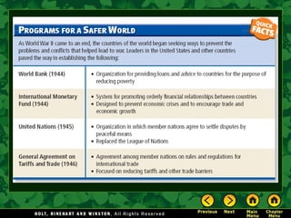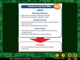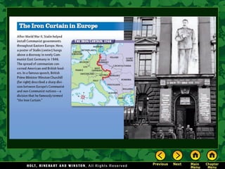 The document provides an overview of events at the end of World War II that led to the Cold War and tensions between the US and Soviet Union. It describes how the Soviets established communist governments across Eastern Europe and installed an "Iron Curtain". The US responded by implementing a containment policy and programs like the Marshall Plan to resist Soviet expansion. It also summarizes domestic developments in the US as troops returned home and the economy transitioned to peacetime.