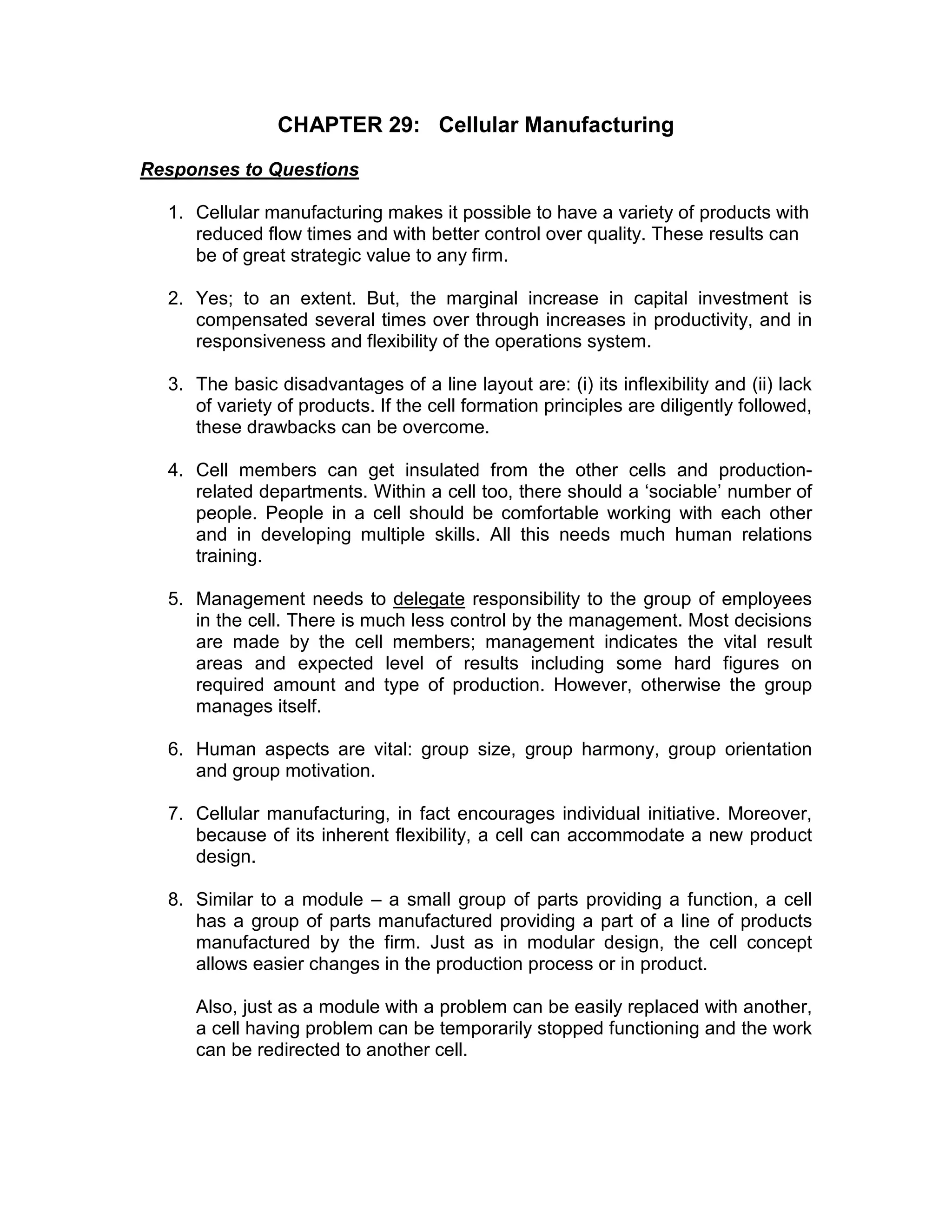 This document discusses cellular manufacturing and group technology. It provides responses to 16 questions on these topics. Some key points covered include: cellular manufacturing allows for reduced flow times and better quality control; the advantages of increased productivity from cellular manufacturing can outweigh increased capital costs; grouping components into families and designing cells based on component and production flow analysis can help overcome the inflexibility of traditional line layouts; and human factors like group size, harmony and motivation are important considerations for cellular manufacturing.
