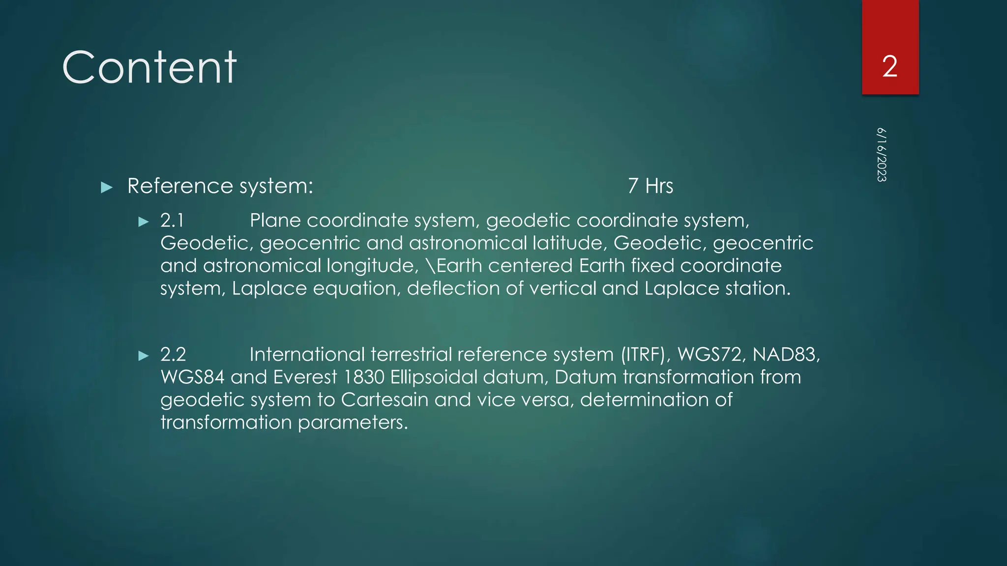 The document discusses various geodetic reference systems, including international terrestrial reference systems like WGS 84, and their importance for surveying, mapping, and infrastructure in Nepal. It covers the differences between local and global ellipsoids, the significance of mean sea level, and the implications of using incorrect datum. Additionally, it details the establishment of the Nepal datum and the transition from previous systems, emphasizing the need for accurate geodetic measurements.