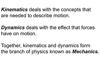 Kinematics deals with concepts of motion like displacement, velocity, and acceleration. Dynamics deals with forces that cause motion. Together they form the branch of mechanics. Displacement is defined as the difference between the final and initial positions. Speed is the distance traveled divided by time. Velocity is displacement divided by time. Acceleration is the rate of change of velocity with respect to time. Equations relate the kinematic variables of displacement, velocity, acceleration, time, and initial velocity. Position-time and velocity-time graphs provide a visual representation of motion and can be analyzed to determine properties like speed, direction of motion, and periods of acceleration.