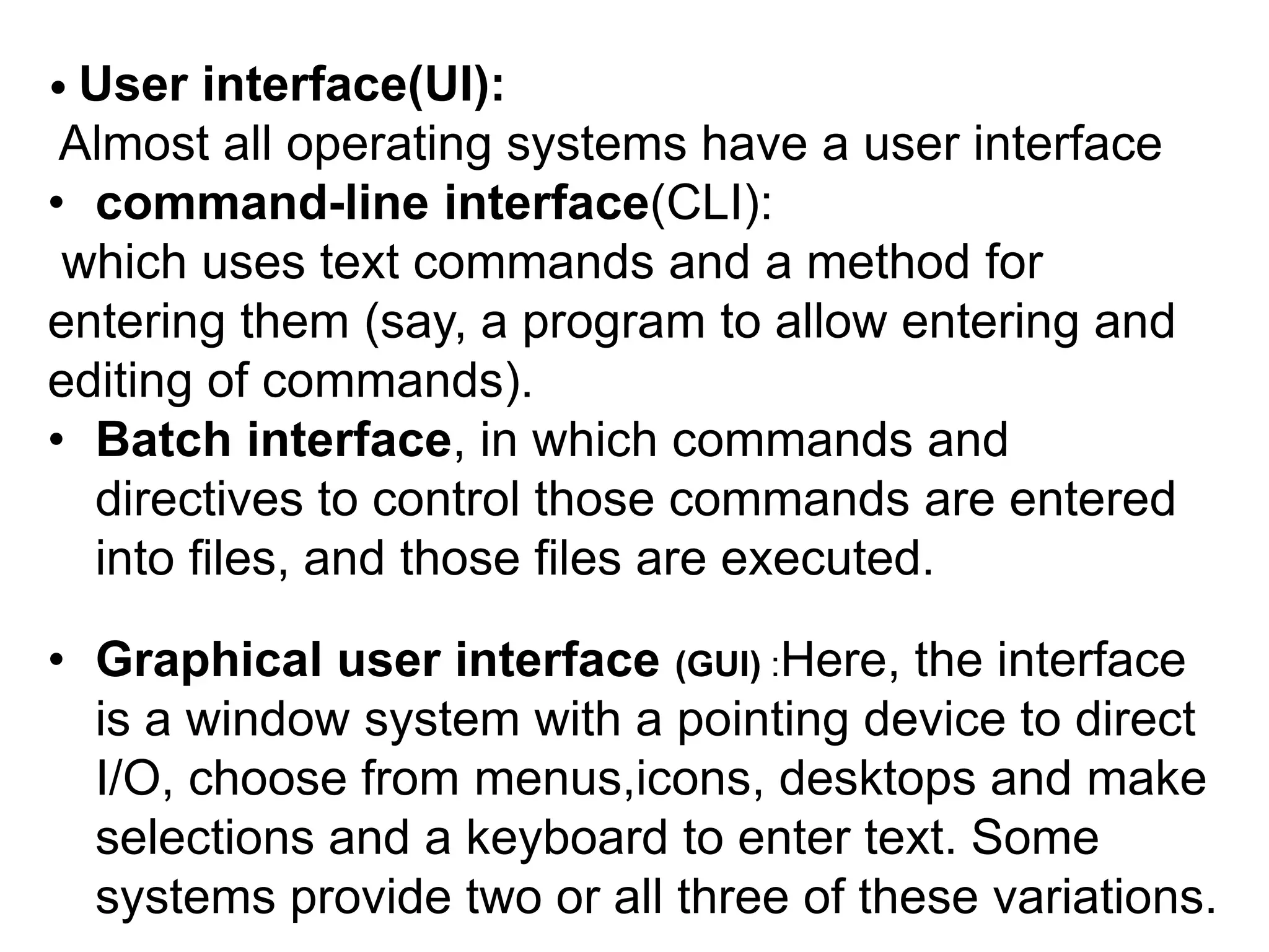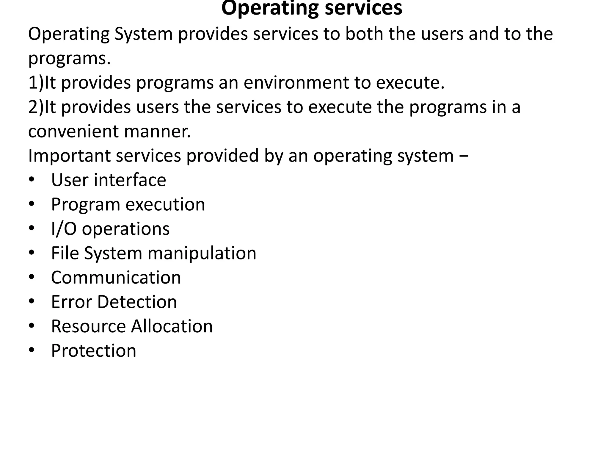 The operating system provides programs an environment to execute and users services to run programs conveniently, including a user interface, program execution, I/O operations, file system manipulation, communication, error detection, and resource allocation. An operating system offers these services through system calls that programs make to request services from the kernel, while hiding the implementation details of system calls from programmers through an application programming interface. Key system calls include process creation, memory management, file access, device handling, protection, and networking.