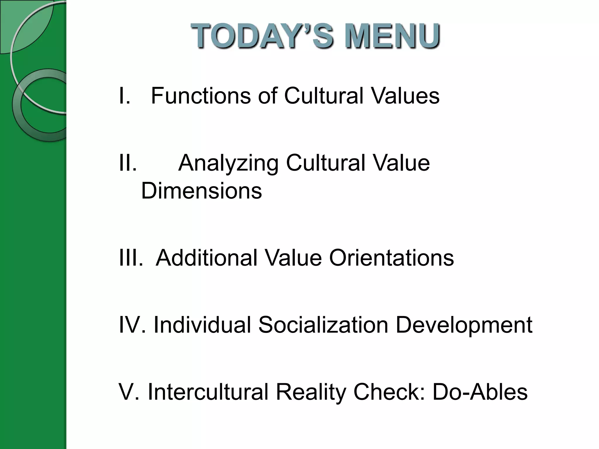 This document appears to be a PowerPoint presentation about cultural values and intercultural communication. The presentation covers the following topics in 3-5 slides each: functions of cultural values, analyzing cultural value dimensions like individualism vs collectivism and masculinity vs femininity, additional value orientations, individual socialization development, and an intercultural reality check method called O-D-I-S. It includes examples, media clips, a self-assessment inventory, and an values exploration exercise to apply the concepts.