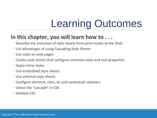 This document discusses an introductory chapter on cascading style sheets (CSS) that covers key concepts such as: