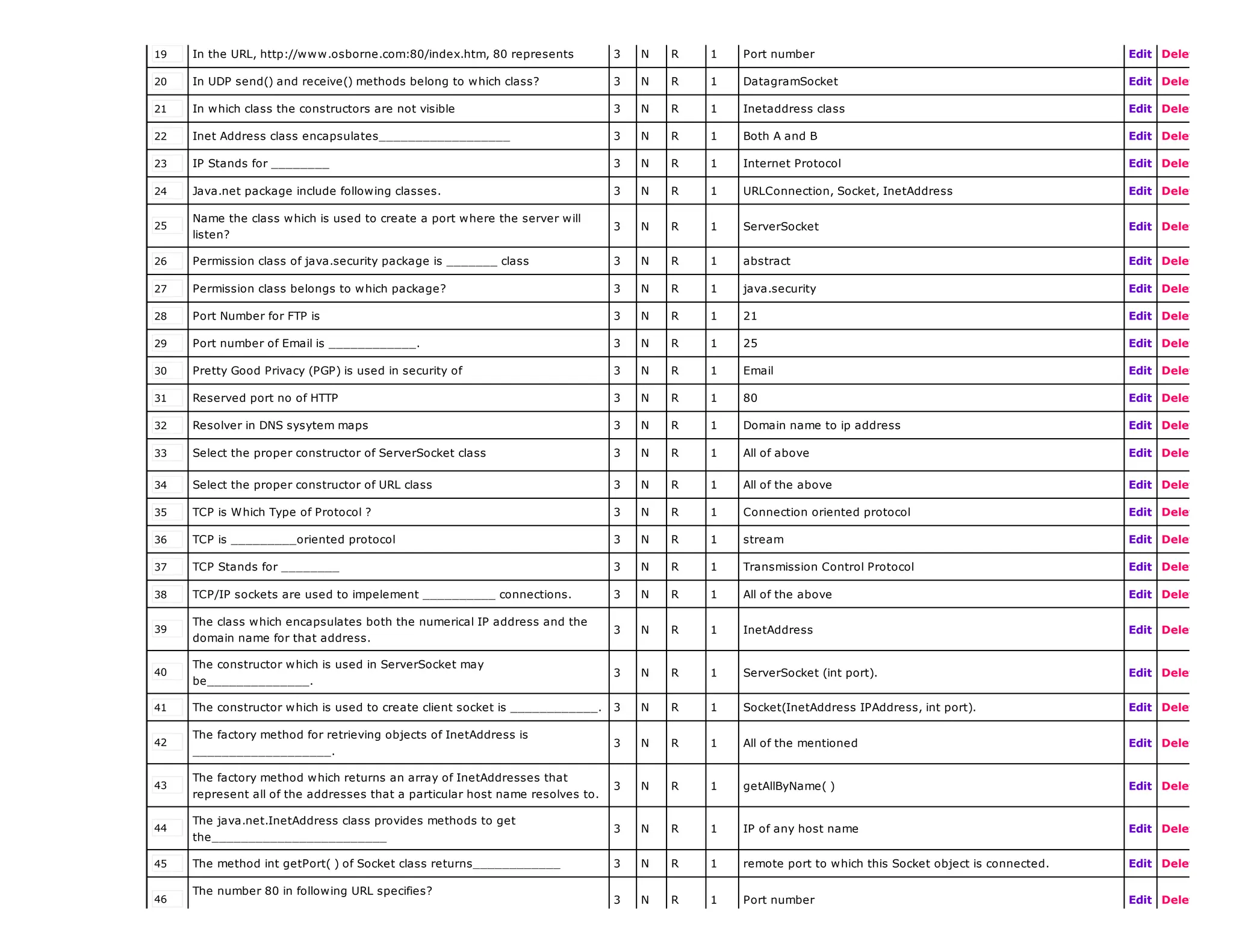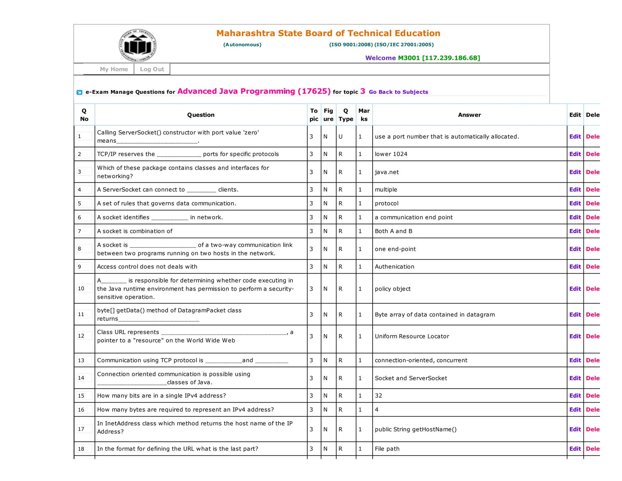 This document contains questions and answers related to advanced Java programming topics such as networking. It includes 100 multiple choice questions covering topics like TCP, UDP, sockets, InetAddress, URL, URLConnection classes. The questions assess understanding of concepts like connection-oriented vs connectionless protocols, port numbers, IP addresses, methods of various networking classes etc.