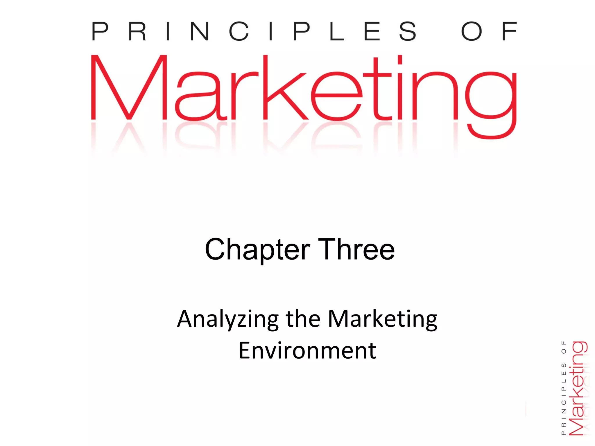 The document outlines the key components of a company's marketing environment, including the microenvironment and macroenvironment. The microenvironment includes factors close to the company like its departments, suppliers, marketing intermediaries, customers, and publics. The macroenvironment comprises broader forces like demographic, economic, natural, technological, political, and cultural factors in the environment. The document discusses how companies must analyze and respond to changes in both the micro and macroenvironments that impact marketing activities.