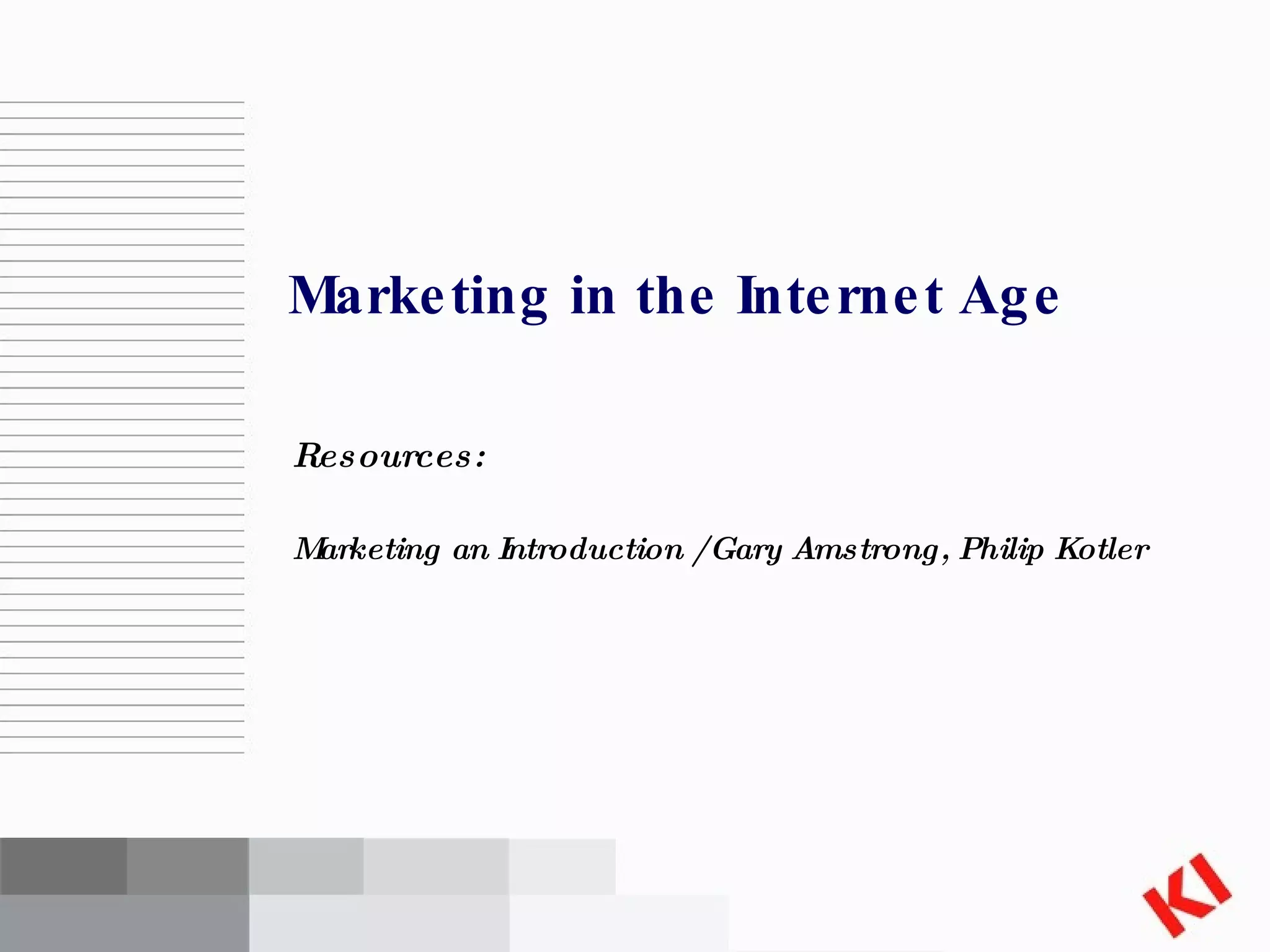 The document discusses marketing strategies in the internet age. It defines e-business and e-commerce, noting that e-commerce specifically involves buying and selling online through activities like e-marketing and e-purchasing. The benefits of e-solutions are listed as convenience for buyers and relationship building, cost reduction, and efficiency for sellers. The domains of e-commerce are identified as B2C (business to consumer), B2B (business to business), C2C (consumer to consumer), and C2B (consumer to business). Methods of e-marketing are outlined, including email, webcasting, corporate websites, online advertising, web communities.