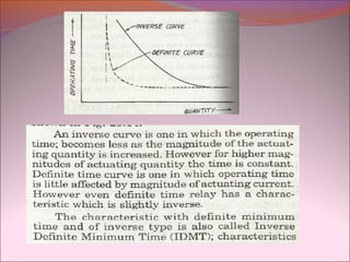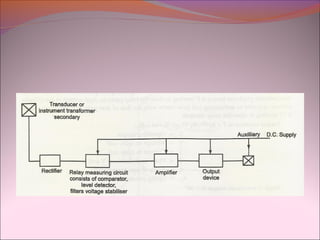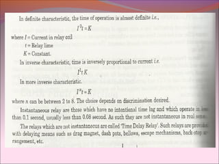 This document discusses various protective relays used in electrical circuits, including electromechanical, solid-state, and microprocessor-controlled types, highlighting their operational mechanisms and applications. It covers important relay characteristics such as selectivity, speed, and sensitivity, alongside specific types of relays like overcurrent, differential, and distance relays. The text further elaborates on the advantages and disadvantages of static and microprocessor-based relays, emphasizing their roles in ensuring system protection and reliability.
