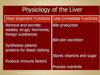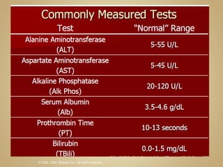 The document discusses various laboratory tests used to evaluate liver function and disease. It describes tests for hepatocellular damage like ALT and AST, tests for cholestasis like alkaline phosphatase, and tests for liver synthetic function like albumin. Common causes of abnormal liver enzymes are also summarized, along with risk factors for liver disease.