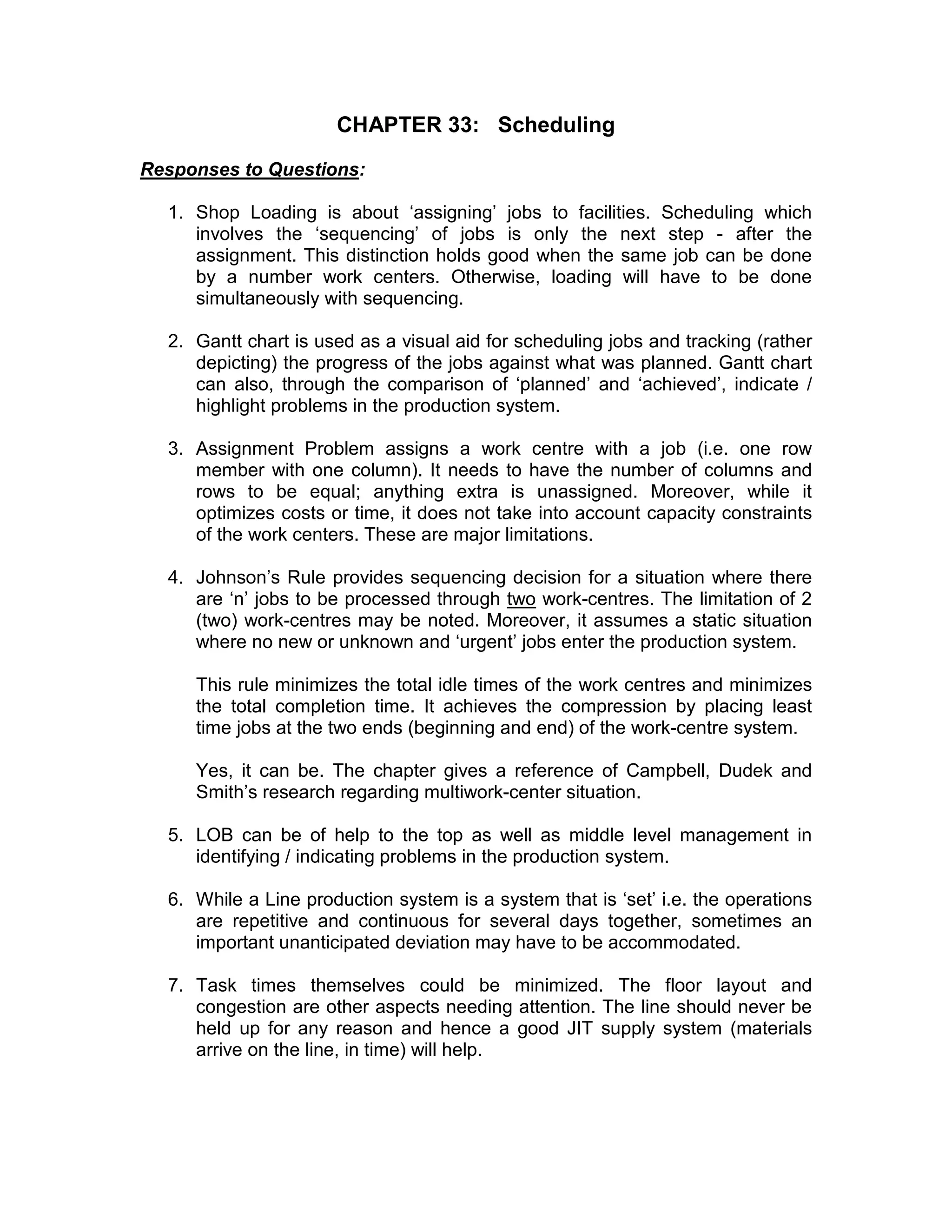 This document provides information about scheduling techniques and concepts. It discusses shop loading vs scheduling, uses of Gantt charts, limitations of the assignment problem and Johnson's rule, how line of balance can help management identify production problems, differences between line production and job shops, and sequencing rules. It also provides sample scheduling problems and solutions using techniques like Johnson's rule, minimum slack per operation, and the assignment problem.