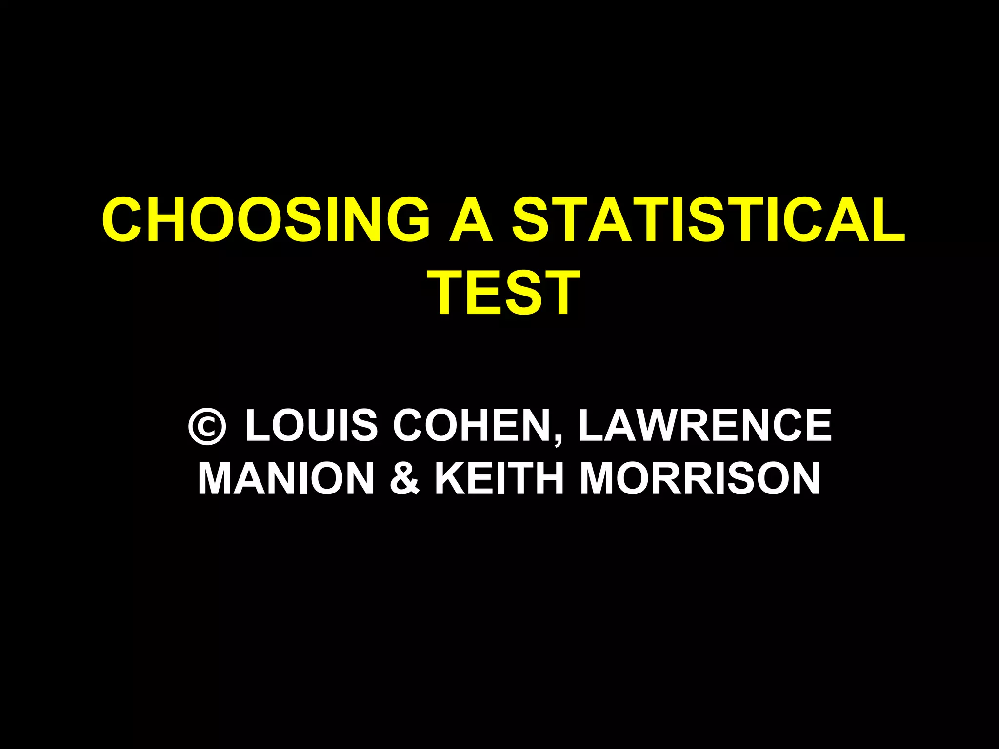 This document provides guidance on choosing appropriate statistical tests based on characteristics of the data and research questions. It outlines initial questions to consider, such as the number of samples, whether the data is parametric or non-parametric, and the number and independence of groups. Tables show which tests are suited for different data scales (nominal, ordinal, interval/ratio) and sample configurations (one sample, two independent samples, two related samples, more than two samples). The assumptions of various statistical tests like t-tests, ANOVA, chi-square, and correlation analyses are also reviewed.