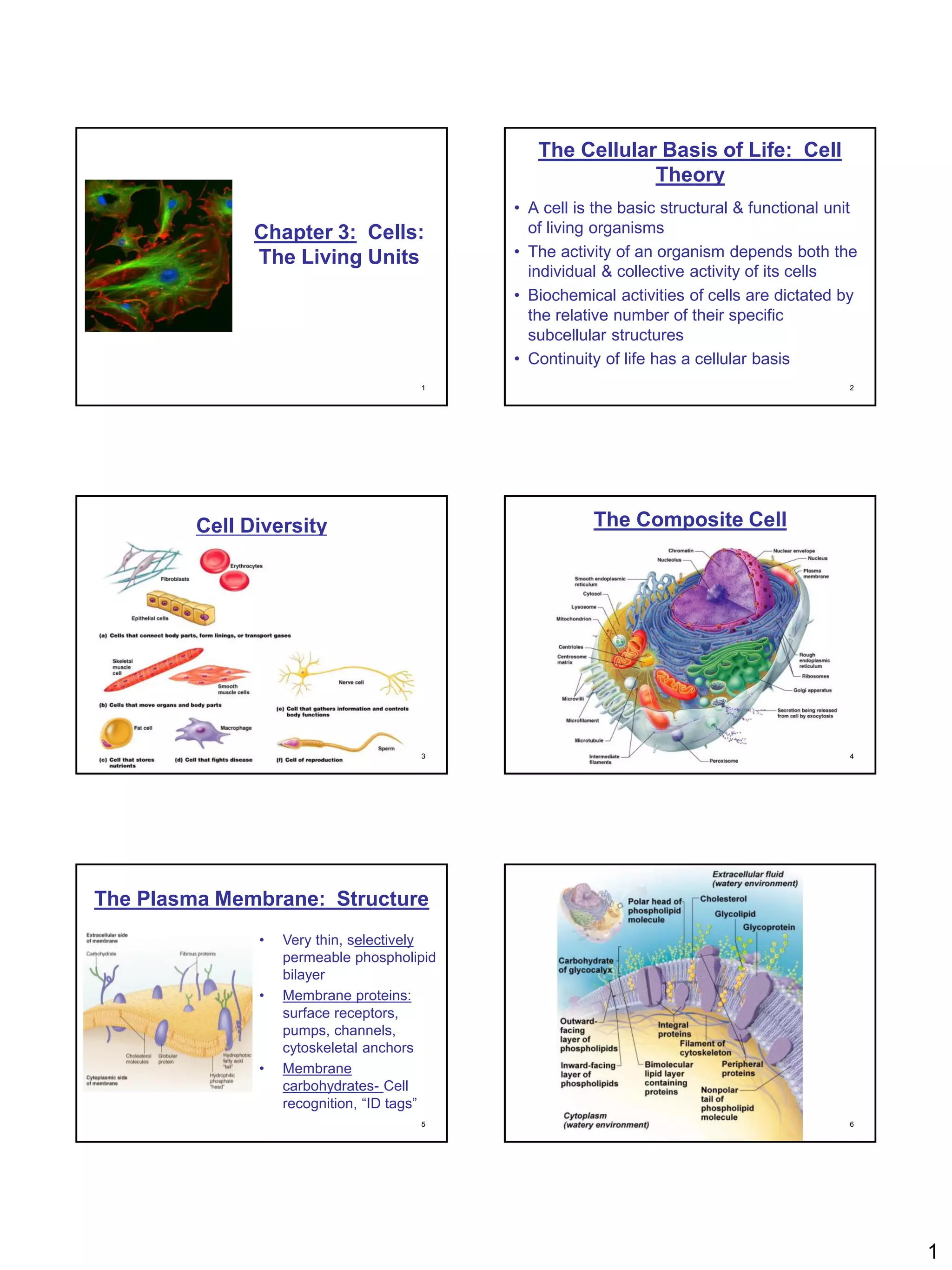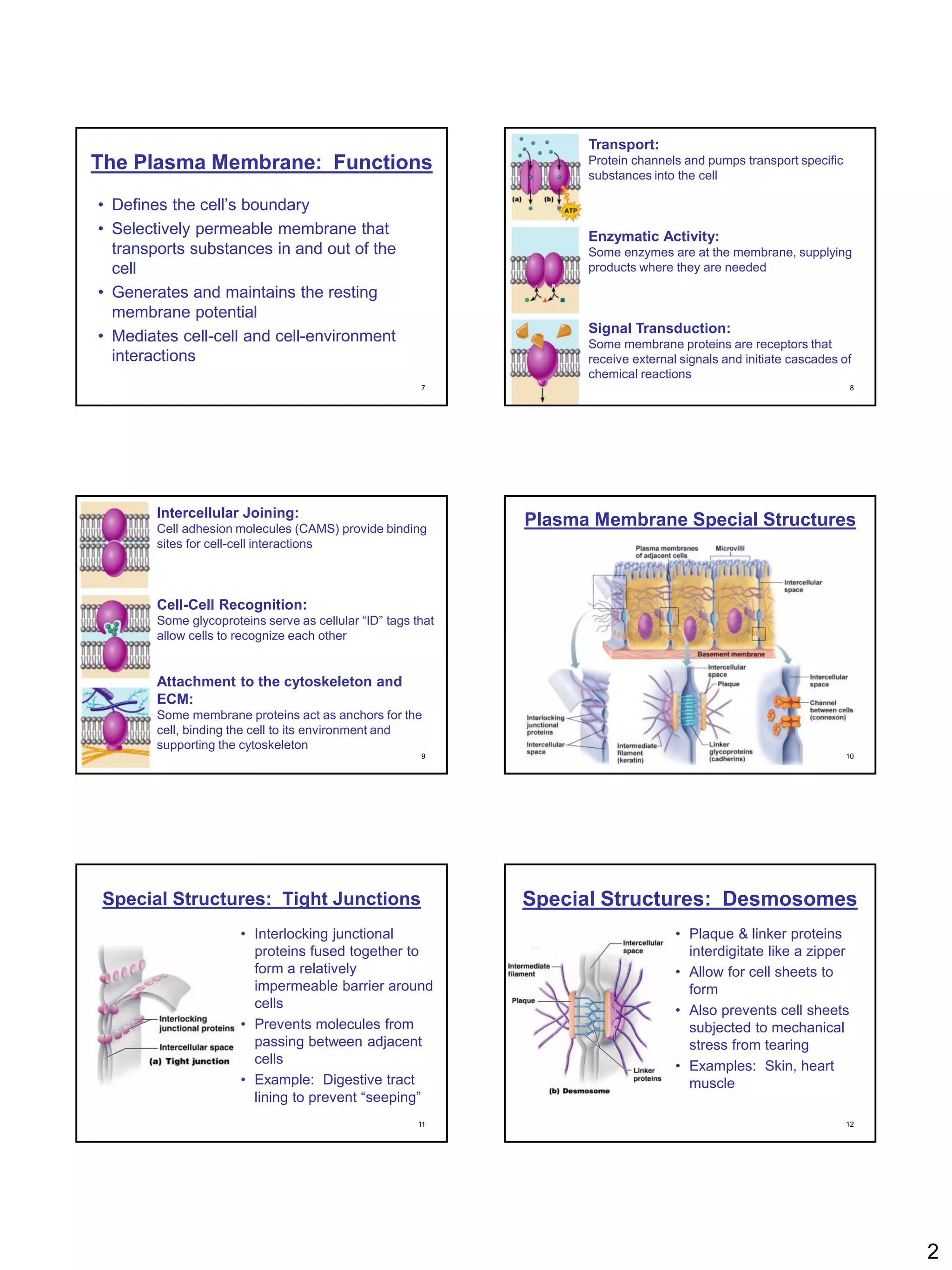 This document discusses the structure and functions of the plasma membrane. It notes that the plasma membrane defines the cell boundary, is selectively permeable, and mediates transport of substances and cell-cell interactions. The document also describes different types of membrane transport including passive transport mechanisms like diffusion, osmosis, and filtration as well as active transport processes. Specific transport proteins and their roles in channel-mediated, carrier-mediated, and osmotic transport are also outlined.