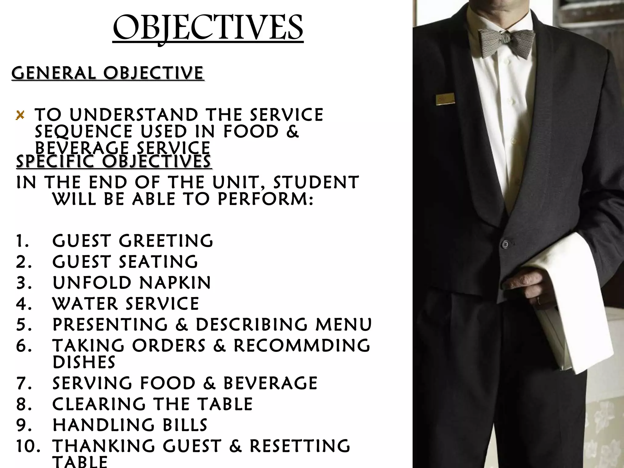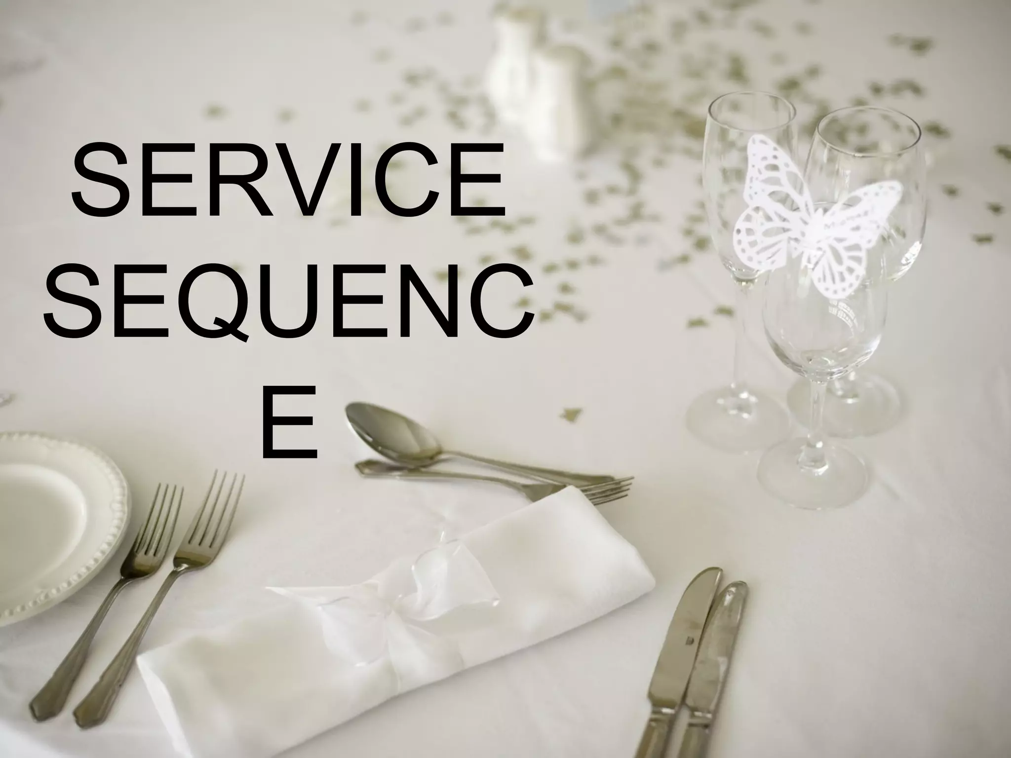This document outlines the service sequence used in food and beverage service. It details 10 steps: 1) greeting guests, 2) seating guests, 3) unfolding napkins, 4) water service, 5) presenting and describing the menu, 6) taking orders and recommending dishes, 7) serving food and beverages, 8) clearing the table, 9) handling bills, and 10) thanking guests and resetting tables. For each step, it provides the objectives and procedures that staff should follow to provide quality service to guests in a restaurant.