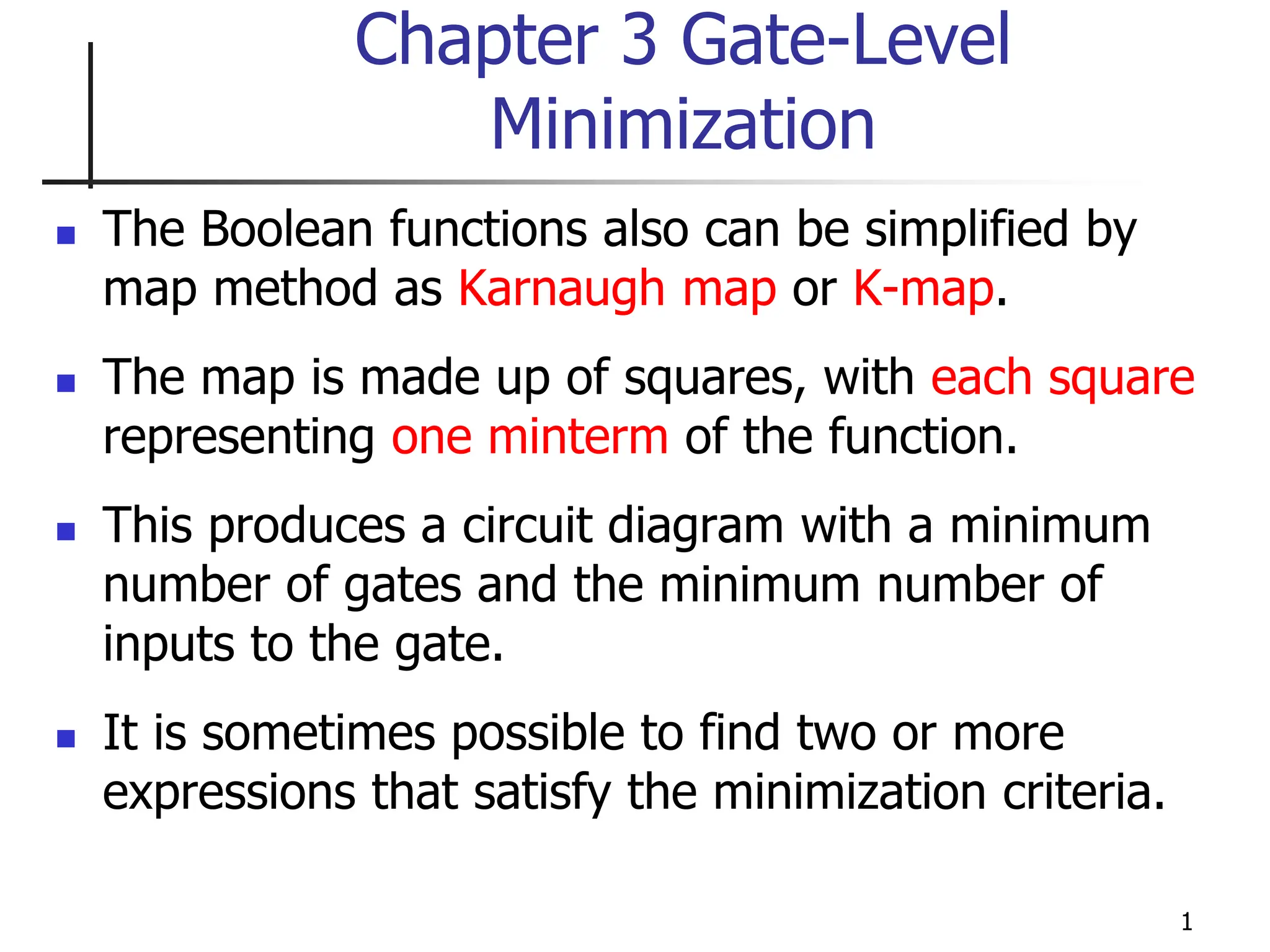 The document discusses Boolean function minimization using Karnaugh maps. It begins by introducing Karnaugh maps and how they are used to simplify Boolean functions into logic circuits with the fewest gates and inputs. Different sized Karnaugh maps are demonstrated, including two-variable, three-variable, and four-variable maps. Techniques for simplifying functions based on the number of adjacent squares in the map are described. Several examples of using Karnaugh maps to minimize Boolean functions are provided.