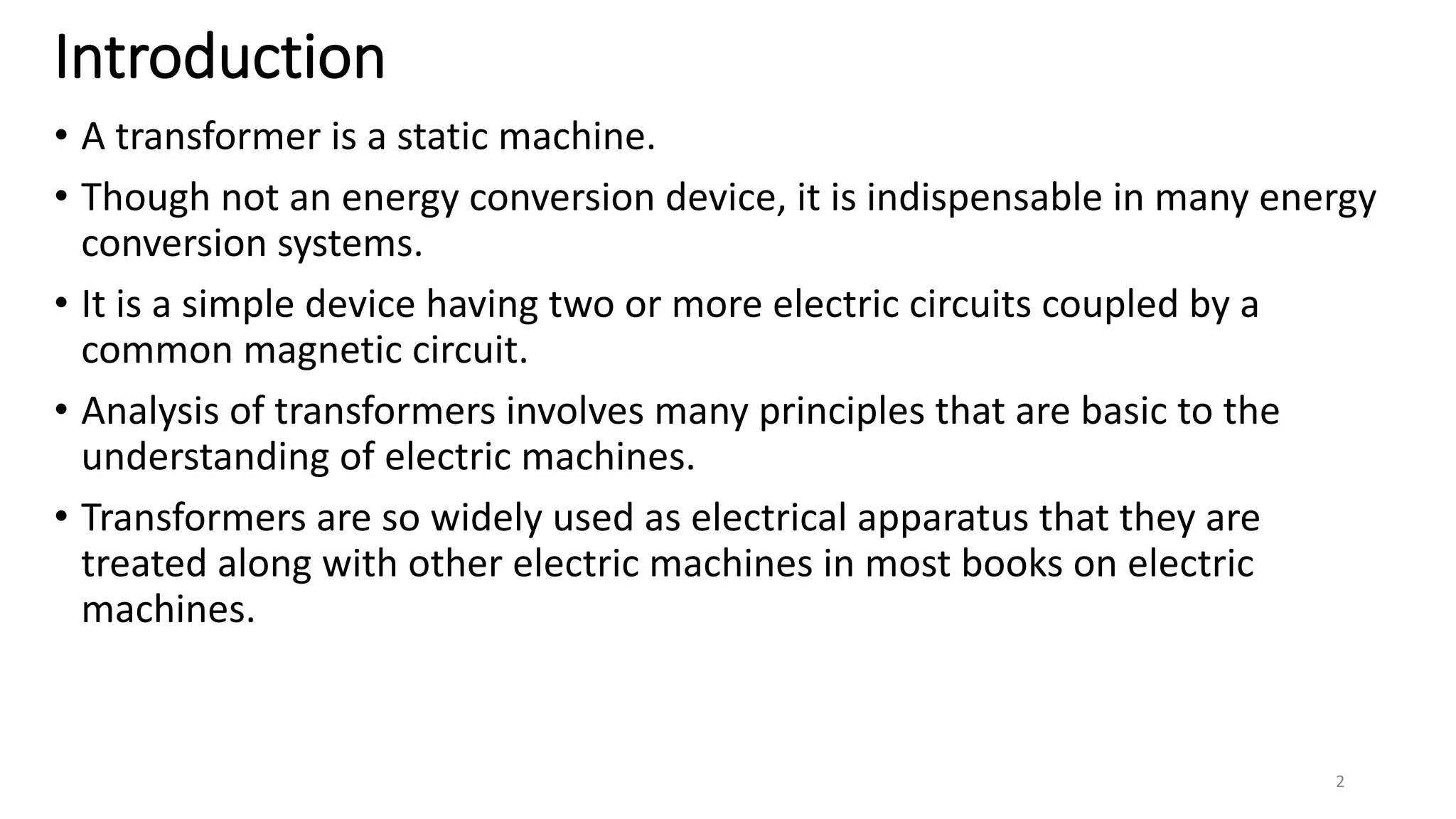 i. A transformer is a static electrical device that transfers energy between two or more circuits through electromagnetic induction. It consists of two or more coils wound around a core.