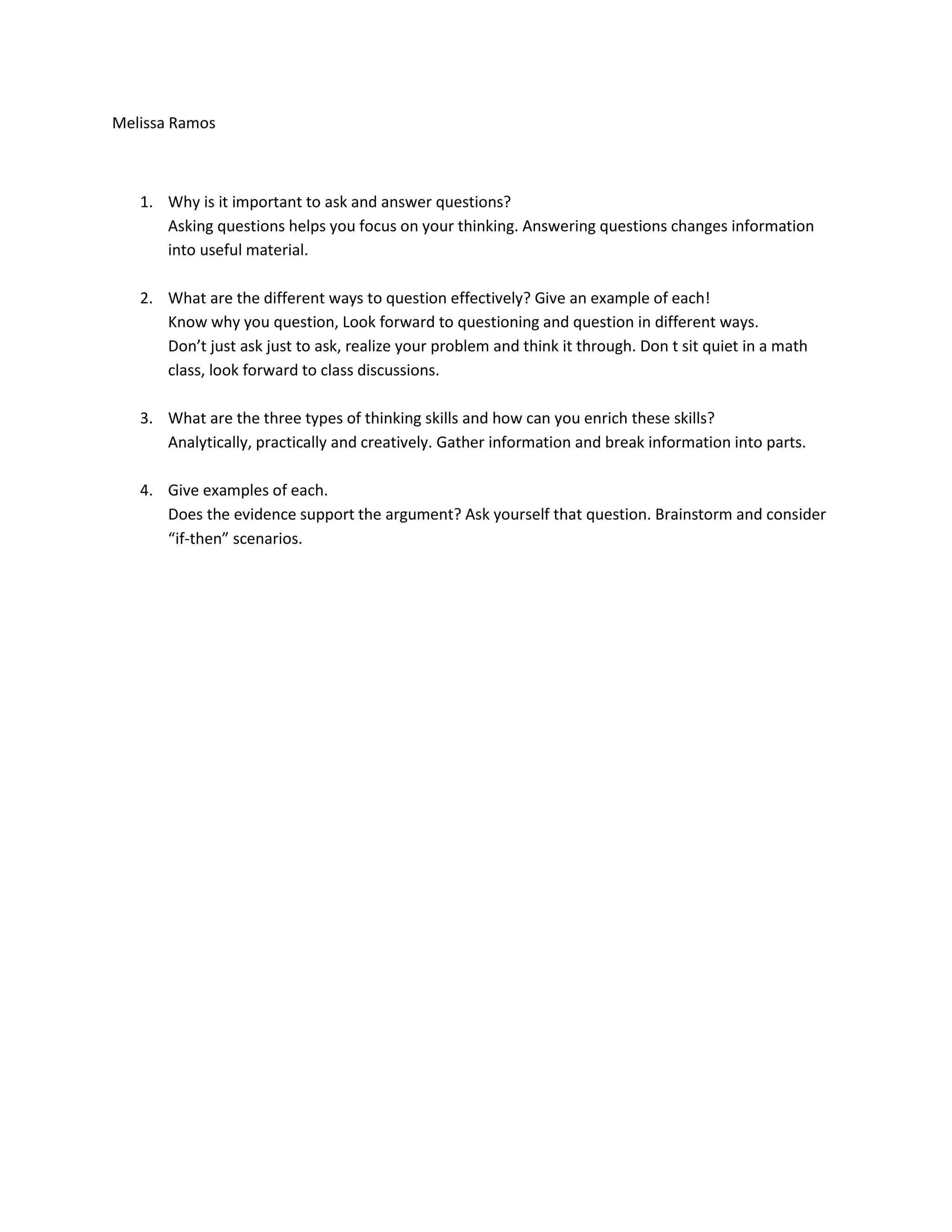 Asking and answering questions helps focus thinking and turn information into useful material. There are different effective questioning techniques such as knowing why you question, looking forward to questioning, and varying questioning styles. The three types of thinking skills are analytical, practical, and creative thinking. Analytical thinking involves gathering and breaking down information while practical thinking uses "if-then" scenarios and creative thinking includes brainstorming.