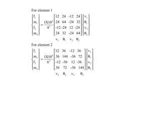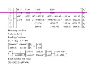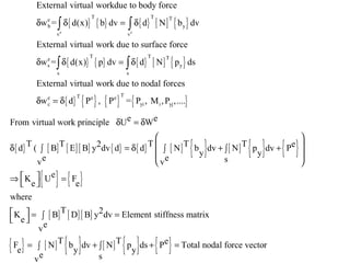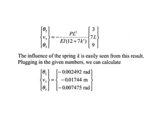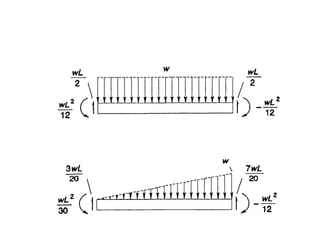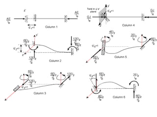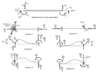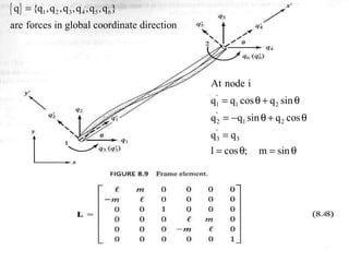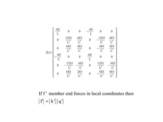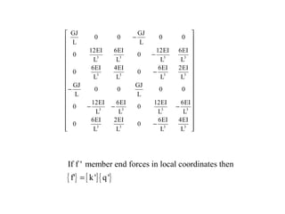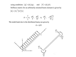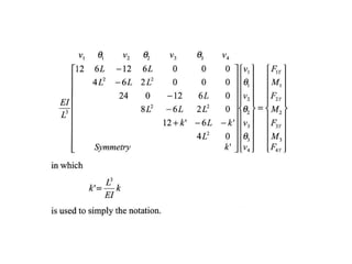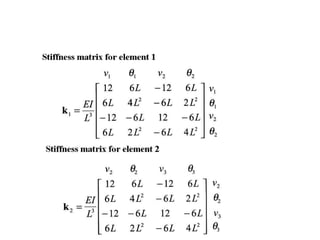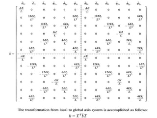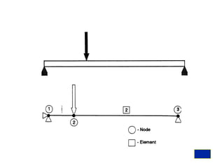 Beam theory can be used to analyze simple beam structures, though more complex beams require more complex modeling. Finite element analysis using beam elements allows for the modeling of two-dimensional and three-dimensional frame structures. Beam elements assume displacement varies linearly along their length and use shape functions to determine forces and moments from applied loads. Three-dimensional beam elements also account for torsional behavior.