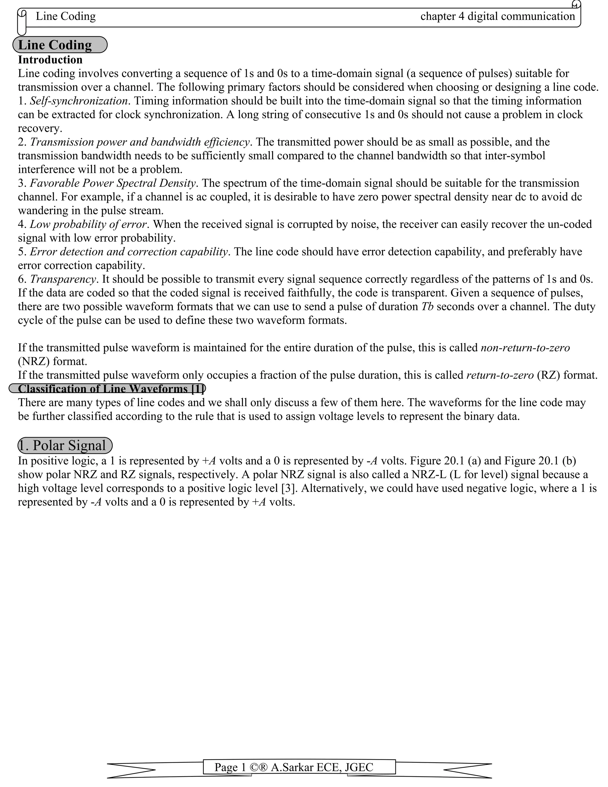 1) Polar signal - Represents 1 as +A volts and 0 as -A volts. Allows easy generation but requires dual supply voltages.