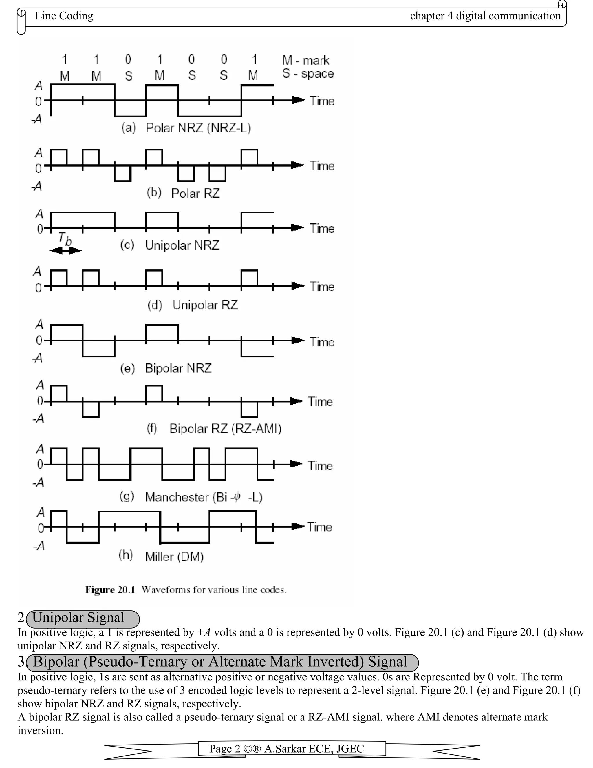 2) Unipolar signal - Represents 1 as +A volts and 0 as 0 volts. Easy generation from single supply but wastes power.