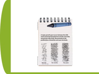 This document summarizes physical, motor, and sensory development in infancy. It discusses patterns of physical growth from head to toe. Motor skills progress from reflexes to rolling, sitting, crawling, and walking. Visual acuity increases while peripheral vision expands. Infants develop depth perception and constancy. Hearing matures to adult levels by 18 months. Coordination of senses allows recognition of objects across modalities. Both nature and nurture influence development as the brain and nervous system myelinate and the environment provides stimulation.