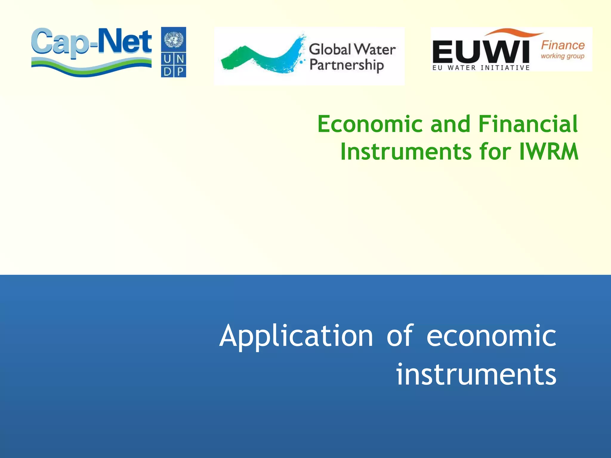 This document discusses various economic instruments that can be used to promote efficiency in water allocation and management. It outlines criteria for evaluating economic instruments, including technical and allocative efficiency, equity, environmental, administrative, and political considerations. Specific instruments discussed include water tariffs, taxes, subsidies, tradable water rights, and fees. The document emphasizes that the appropriate economic instruments depend on the local context and should be selected through a participatory process.
