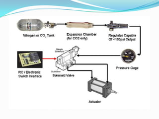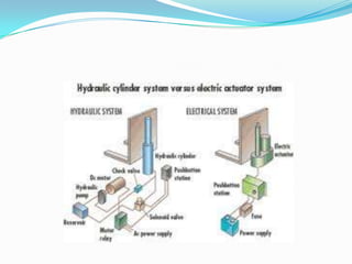 This chapter discusses different types of actuators used to control movement in robots. It describes pneumatic, hydraulic, and electrical motor systems. Pneumatic systems use compressed air and are low-cost but have limitations from air compressibility. Hydraulic systems provide greater speed and strength but require more space. Electrical motor systems like DC, AC, servo, and stepper motors offer more accuracy and repeatability than hydraulic systems. The chapter compares advantages and disadvantages of pneumatic and hydraulic actuators and describes various linear and rotary configurations for each system.