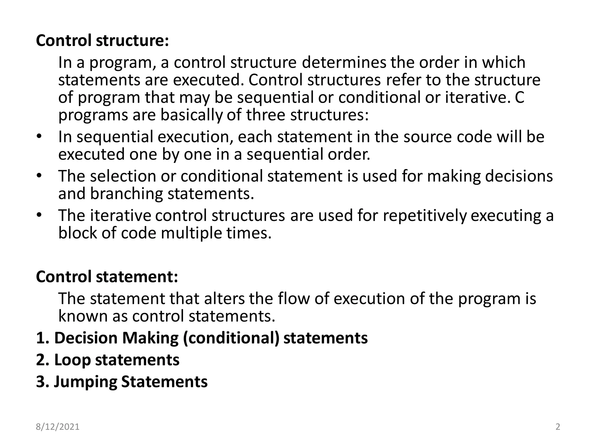 The document discusses control structures in C programming. It defines control structures as determining the order of statement execution and categorizes them as sequential, conditional, or iterative. Conditional statements include if-else statements, switch statements, and ternary operators for decision making. Iterative statements include for, while, and do-while loops for repetitive execution. The document provides syntax examples and flowcharts for each control structure. It also discusses jumping statements like goto, break, and continue that alter normal program flow.