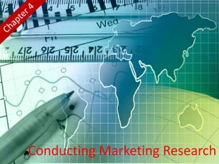 The document discusses marketing research and metrics. It describes the marketing research process as having 6 steps: 1) define the problem, 2) develop a research plan, 3) collect information, 4) analyze the information, 5) present findings, and 6) make a decision. It also discusses characteristics of good marketing research and different metrics that can be used to measure marketing productivity such as awareness, market share, and customer satisfaction. Marketing-mix modeling and dashboards are presented as tools to quantify and interpret various marketing metrics.