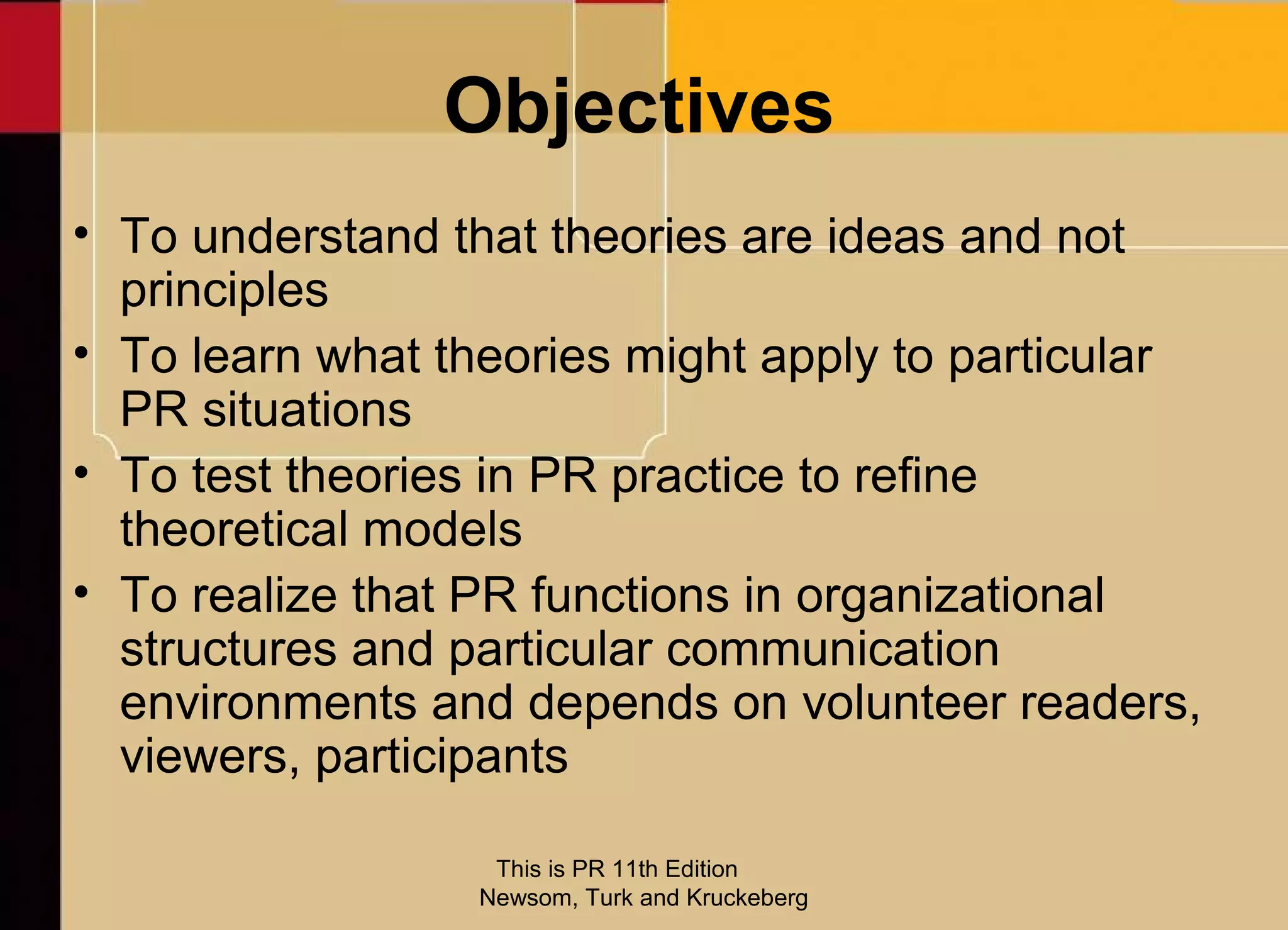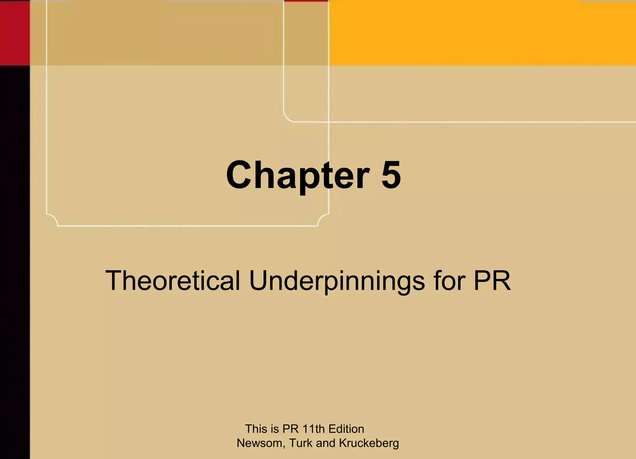This chapter discusses various theories that underpin public relations, including sociological, psychological, organizational, communication, and persuasion theories. It explores concepts like framing, propaganda, opinion leadership, and impediments to persuasion. Theories of media and models of persuasion are also summarized, including Cialdini's principles of self-persuasion and Earl Newsom's persuasion principles.