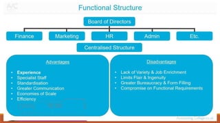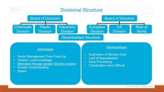Organizing involves identifying and grouping activities into jobs, departments, and sections. It brings together resources to achieve goals. The key steps are: (1) identifying and dividing work, (2) grouping similar activities into departments, (3) assigning duties to employees, and (4) establishing reporting relationships. Organizing provides benefits like specialization, clear relationships, optimal resource use, adaptability, and effective administration. Functional and divisional structures are two common organizing structures. A functional structure groups jobs by similarity, while a divisional structure splits the organization into semi-autonomous product-based divisions.