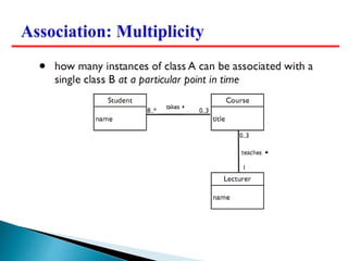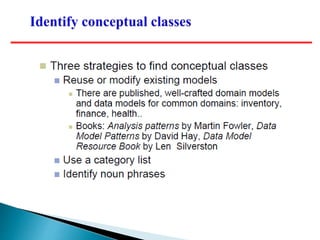 This document provides information on object oriented analysis and use case modeling. It discusses identifying objects and their relationships, defining object operations and attributes, and modeling system functionality through use cases. Use cases describe interactions between actors and the system, including typical workflows, alternative scenarios, and pre- and post-conditions. Use case diagrams visually represent the relationships between actors and use cases.