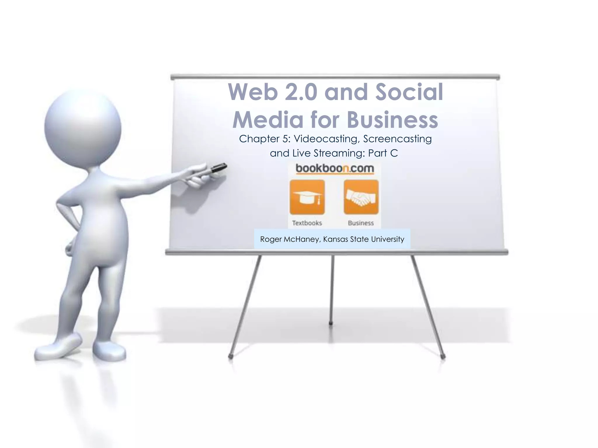 Web 2.0 applications have enabled live streaming and screencasting for businesses and individuals. The document discusses tools like Stickam, Tinychat, Ustream, and Skype that allow live video broadcasting from computers and mobile devices. It also covers features of live streaming like embedding players, importing media, and interactive chat. Live streaming provides opportunities for businesses to engage customers in real-time and create archived content.
