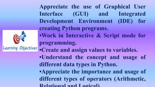 3) Input and output functions like print() and input() allow user interaction and display of results. Comments, identifiers, keywords, tokens and literals are also explained.