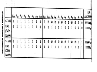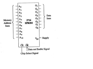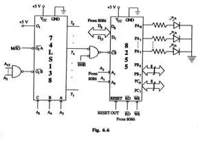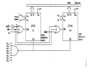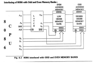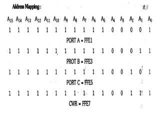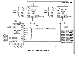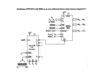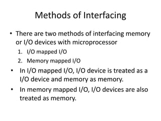 The document explains two methods for interfacing memory or I/O devices with a microprocessor: I/O mapped I/O and memory mapped I/O. It details the addressing schemes, associated instruction sets, and connections required for implementing these interfacing methods. Additionally, it describes chip selection logic and considerations for memory size and address line requirements.