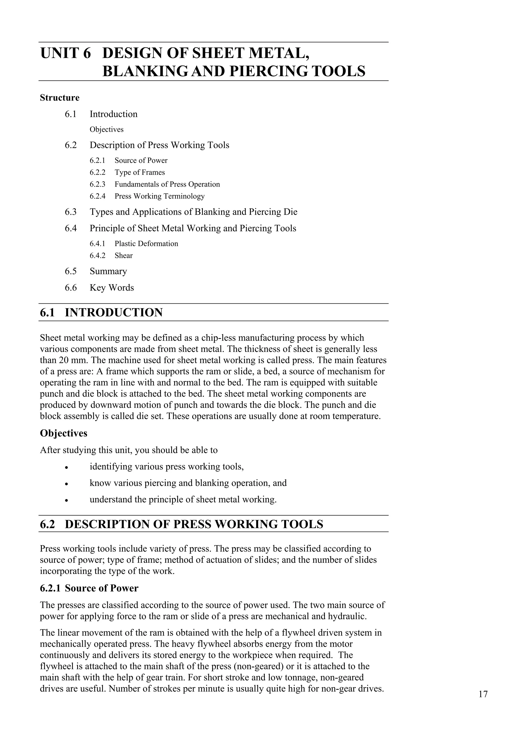 This document discusses sheet metal working tools and presses. It begins by defining sheet metal working as a chip-less manufacturing process for making components under 20mm thick from sheet metal, using a machine called a press. Presses are then classified based on their power source (mechanical or hydraulic), frame type (gap or straight side), number of slides (single, double, triple action), and actuation method (crankshaft, eccentric, etc.). Key press components like the bed, bolster plate, die set, punch, and stripper are also defined. Blanking and piercing dies are introduced, with dies classified by operation type (cutting vs. forming) and method of operation. The objectives are to identify various press