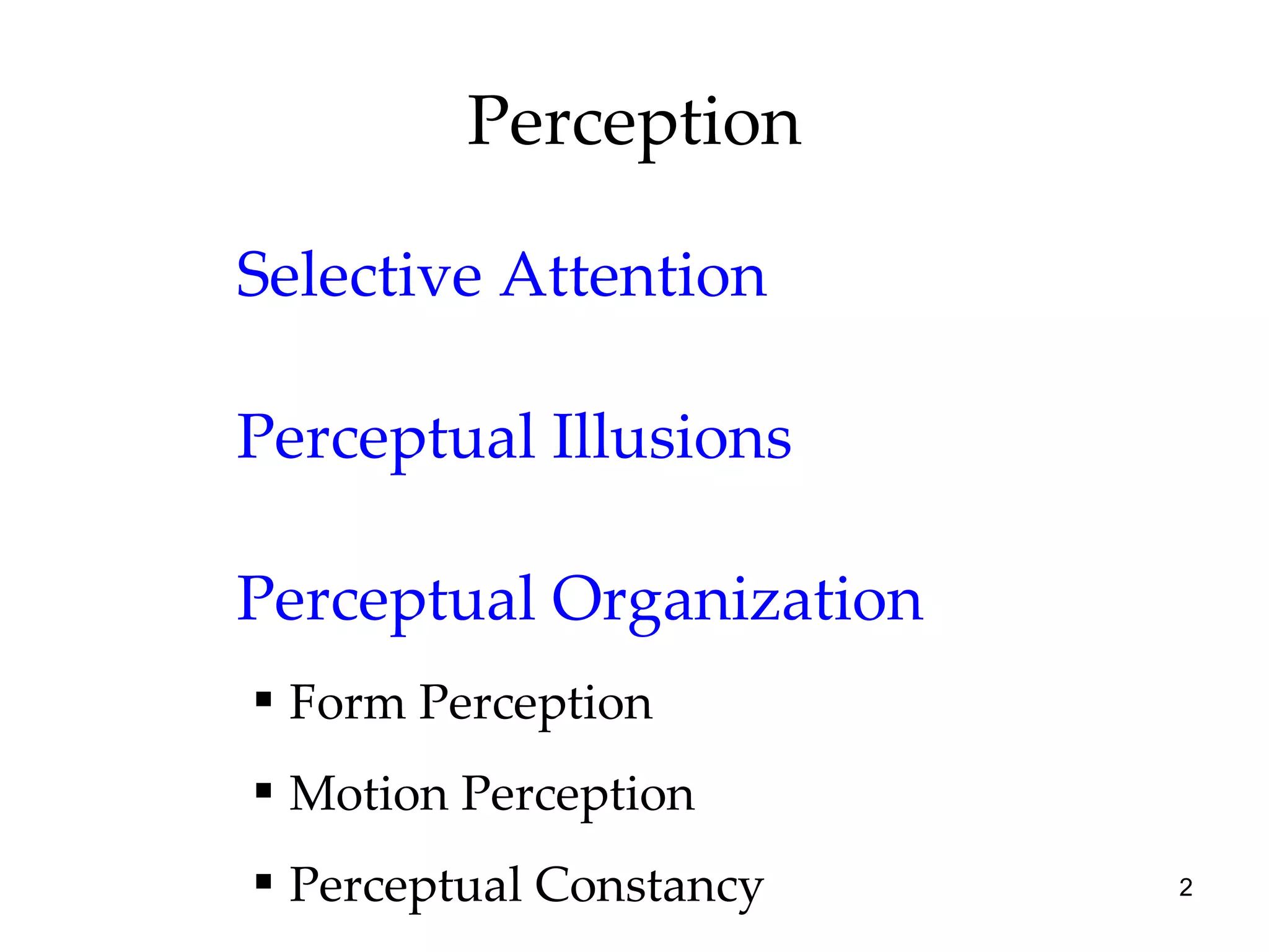 This document provides an overview of key topics in perception, including selective attention, perceptual illusions, perceptual organization, depth perception, motion perception, perceptual constancy, perceptual interpretation, sensory deprivation and restored vision, perceptual adaptation, perceptual set, and the role of human factors in perception. It discusses experimental findings and defines important concepts such as inattentional blindness, change blindness, grouping principles, monocular and binocular depth cues, shape and size constancy, and schemas. Examples of perceptual illusions and demonstrations of perceptual effects are also described.